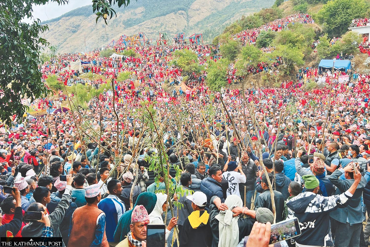 Devotees, holding tree branches in their hands, participate in the final day of the five-day Digre fair in Musikot, Rukum West, on Monday. The annual fair begins on Haribodhini Ekadashi (11th day of waxing moon) at the temple of goddess Digre Sai Kumari and concludes on Kartik Purnima (full moon), which fell on Monday this year. The fair attracts thousands of people from several districts. Mahesh KC/TKP