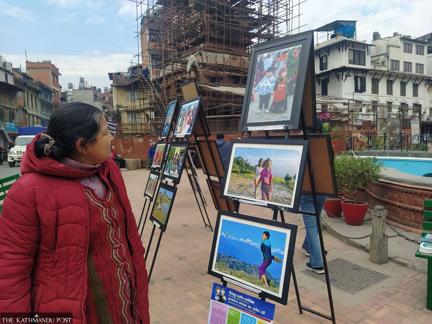 A woman pauses to appreciate photographs at an exhibition at Patan Durbar Square, on Thursday. Deepak KC/TKP