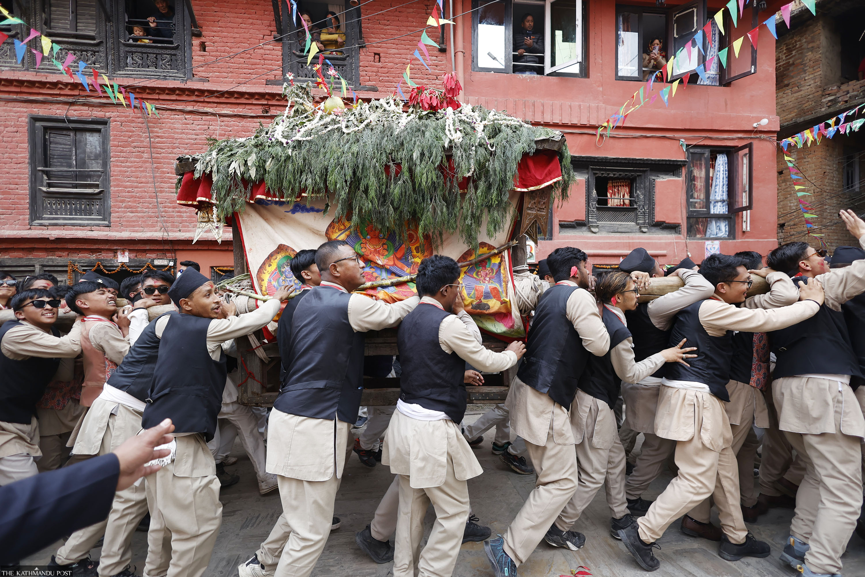 Devotees carry the idol of Goddess Indrayani in a palanquin during the Indrayani Jatra procession in Kirtipur on Friday. The goddess is taken around seven medieval townships on the southern fringes of the Kathmandu Valley over several days every year. Sanjog Manandhar/TKP