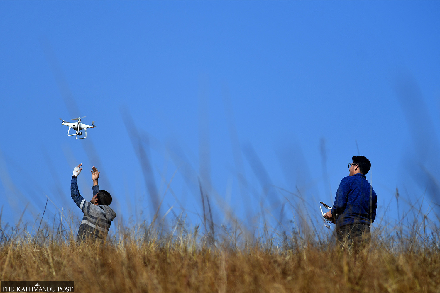 Young men launch a drone at Sikali Temple in Khokana, Lalitpur. Deepak KC/TKP