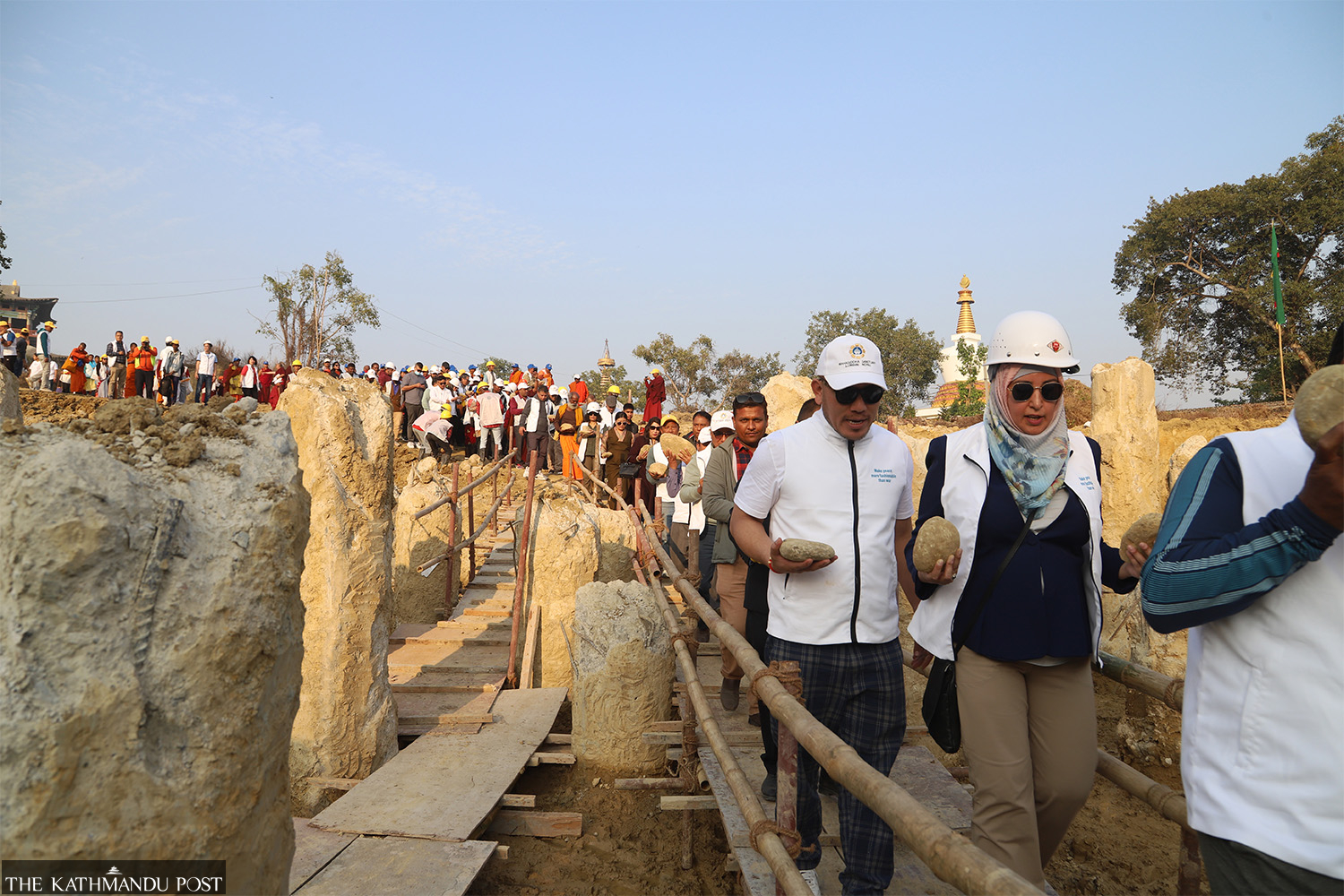 Monks and diplomats join local residents as they volunteer to build the Vishwa Shanti Dham in Lumbini, the Buddha’s birthplace, on Sunday. Estimated to cost Rs5 billion, work on the structure, four stories and 44 metres tall, started four years ago but had stalled due to the pandemic. Manoj Paudel/TKP
