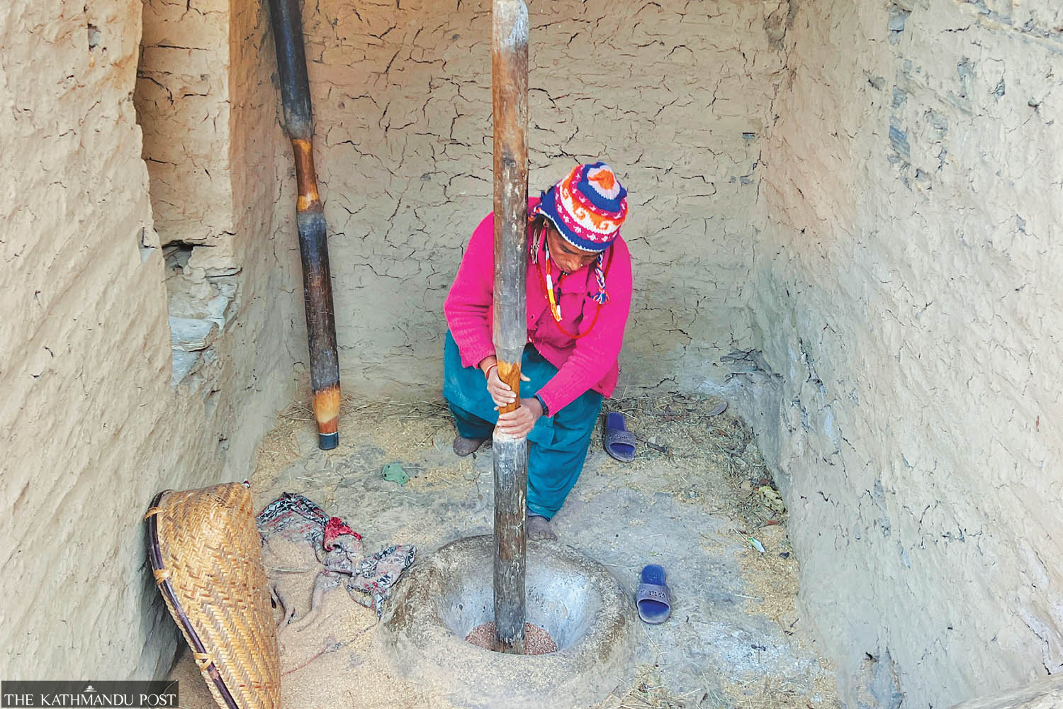 A woman uses the traditional mortar and pestle to husk rice at Bayala of Barekot Rural Municipality ward 1 in Jajarkot district on Monday. While mills are common in most parts of the country, this underdeveloped region is still without basic amenities, adding to people’s hardships. Mahesh KC/TKP
