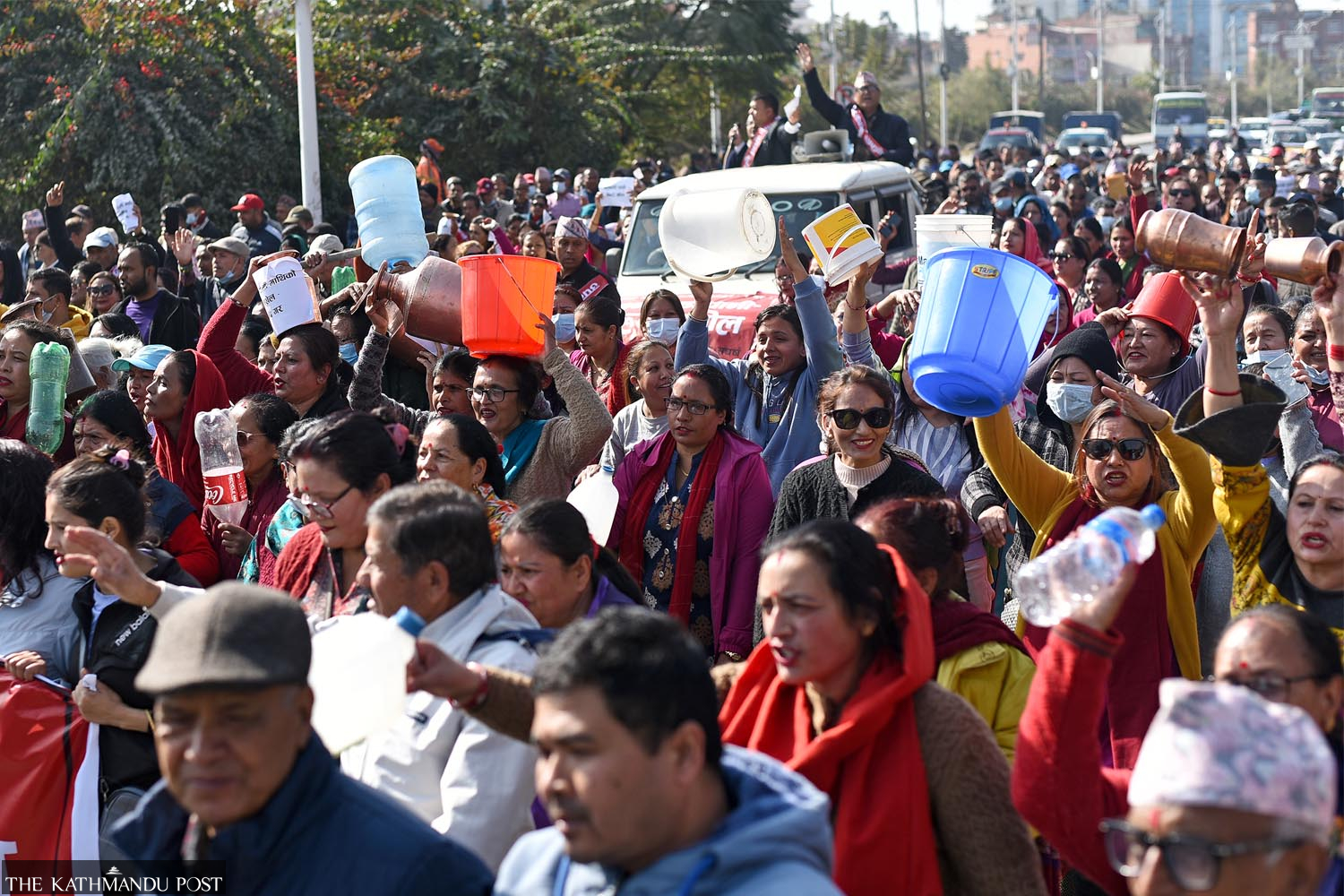 Kathmandu residents demonstrate in Tinkune on Monday demanding a speedy distribution of Melamchi project’s water in the Capital. Angad Dhakal/TKP