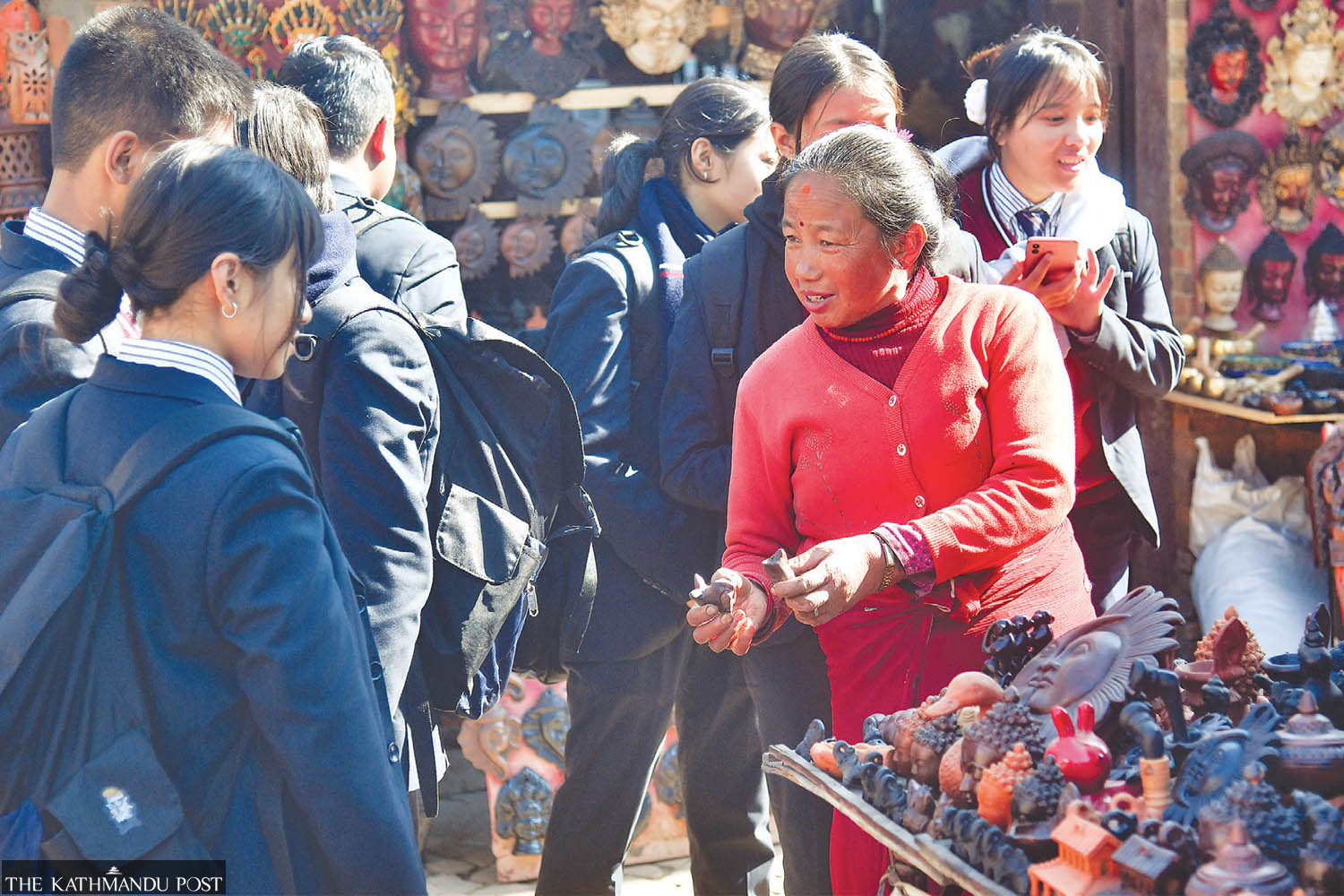 A vendor shows handicraft items to students at Pottery Square in Bhaktapur. Deepak KC/TKP