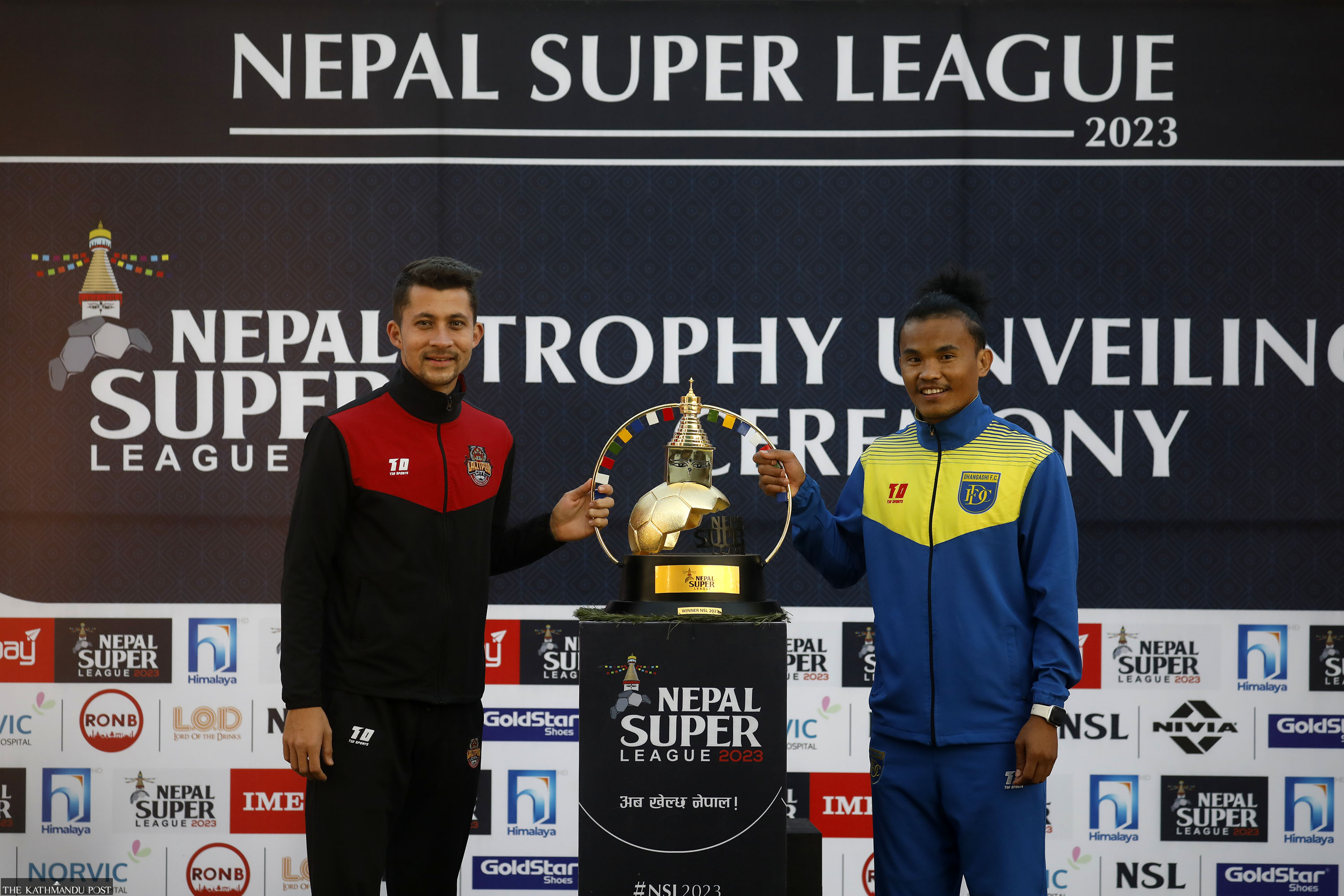 Lalitpur City captain Ananta Tamang (left) and Dhangadhi skipper Devendra Tamang pose with the Nepal Super League trophy on the eve of their final match at the Dasharath Stadium in Kathmandu on Friday. The two sides battle for the title on Saturday. Hemanta Shrestha/TKP