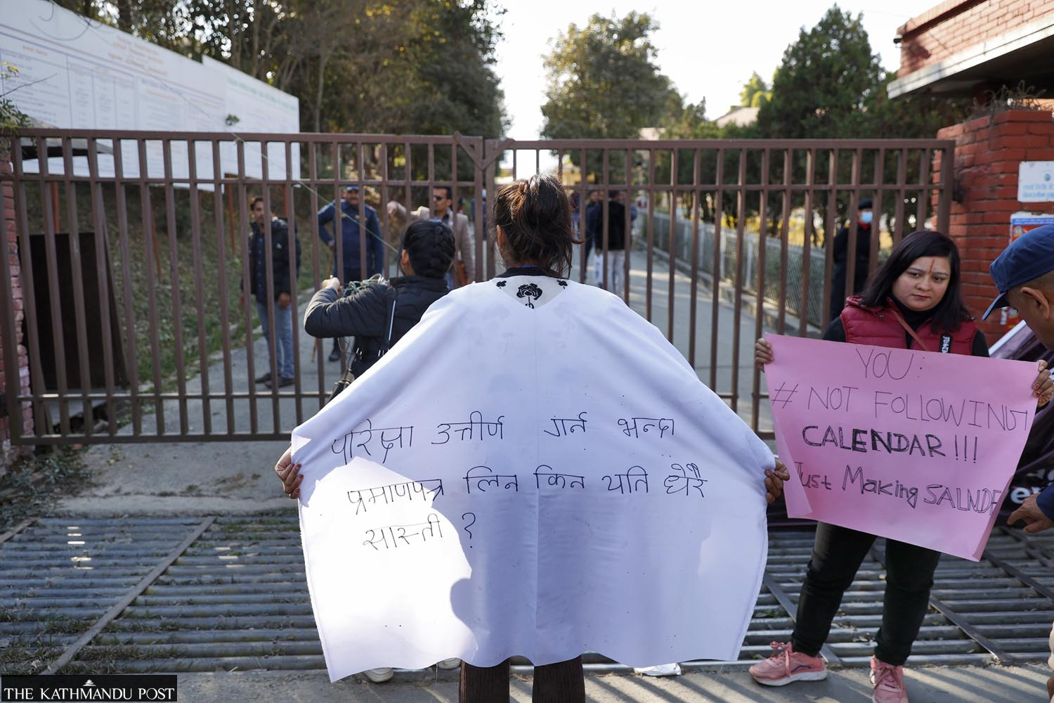 Students from Tribhuvan University central campus demonstrate at the TU exam controller’s office at Balkhu, Kathmandu, demanding reforms in the examination system, on Wednesday. The banner in Nepali reads: ‘Why more hassles in getting the certificate than in passing the exam?' Sanjog Manandhar/TKP