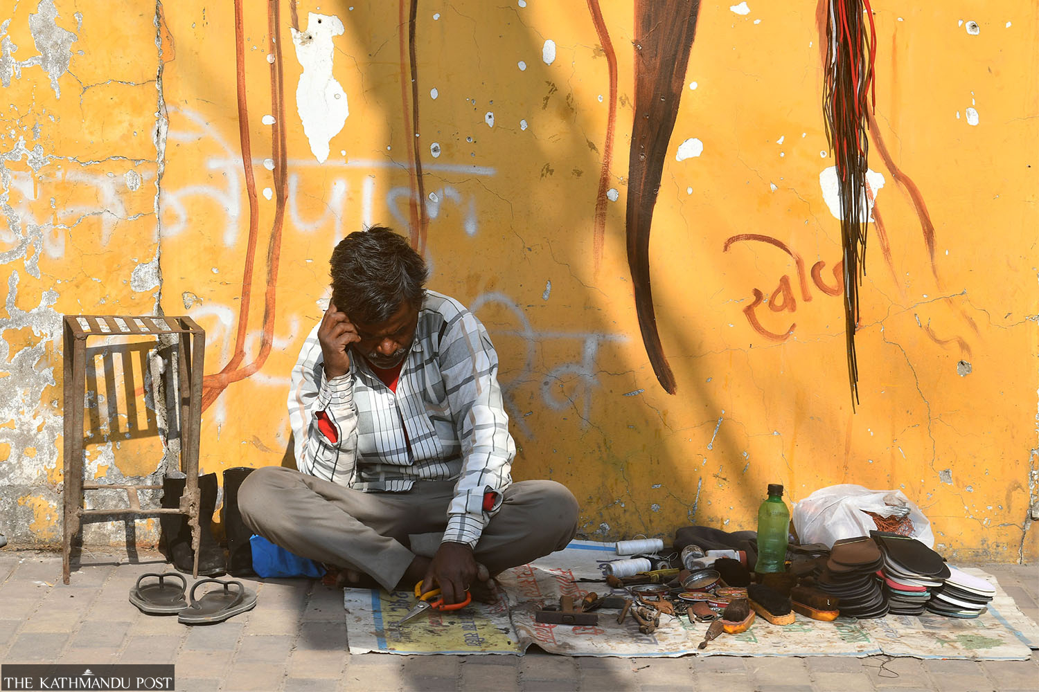 A roadside cobbler speaks on the phone as he awaits customers in Thapathali, Kathmandu on Monday. Deepak KC/TKP