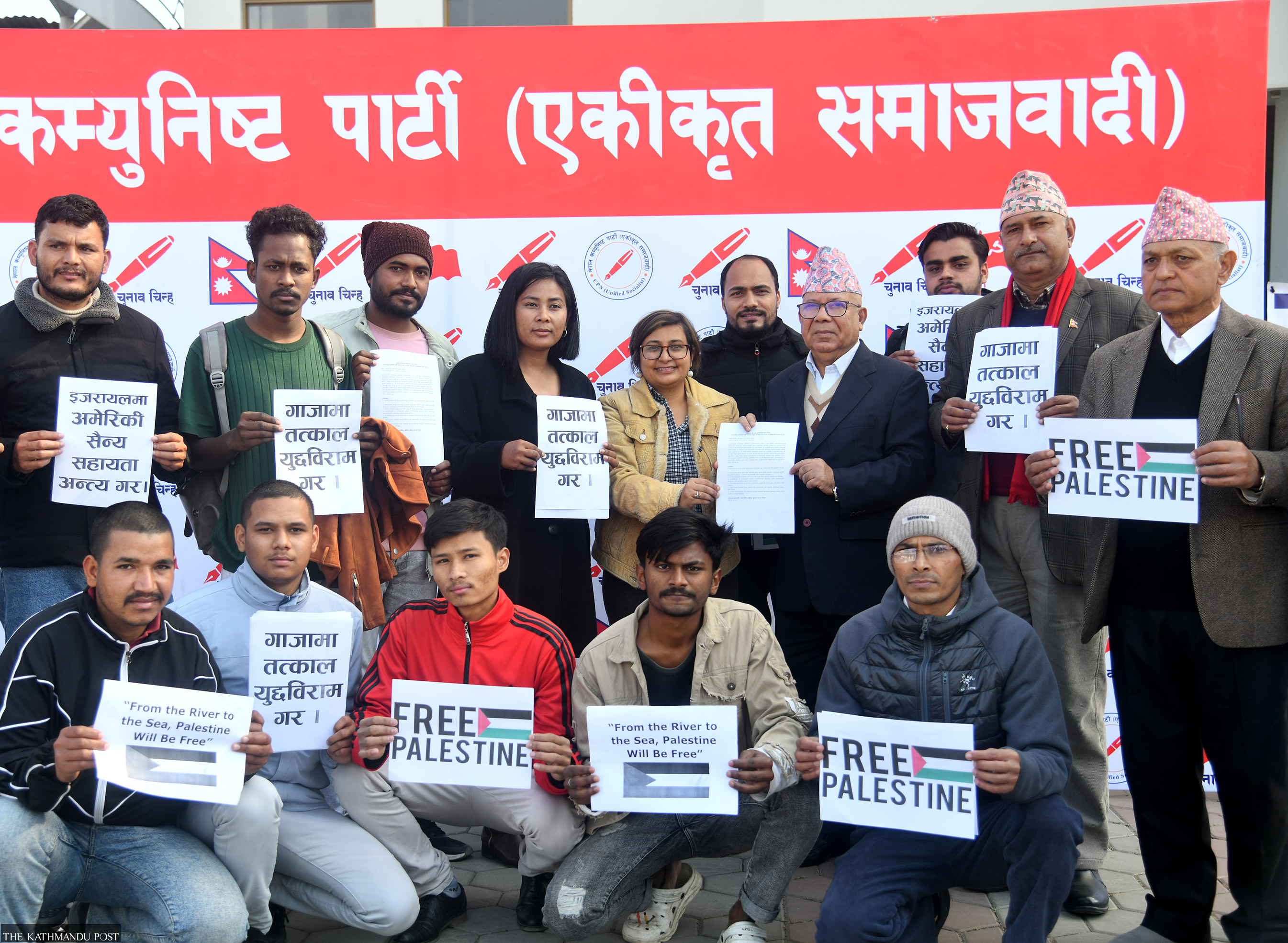 CPN (Unified Socialist) chair Madhav Nepal (second row, third from right) receives a memo from the party’s sister wings on Friday at Gwarko in Lalitpur, calling for an immediate ceasefire in Gaza. Deepak KC/TKP