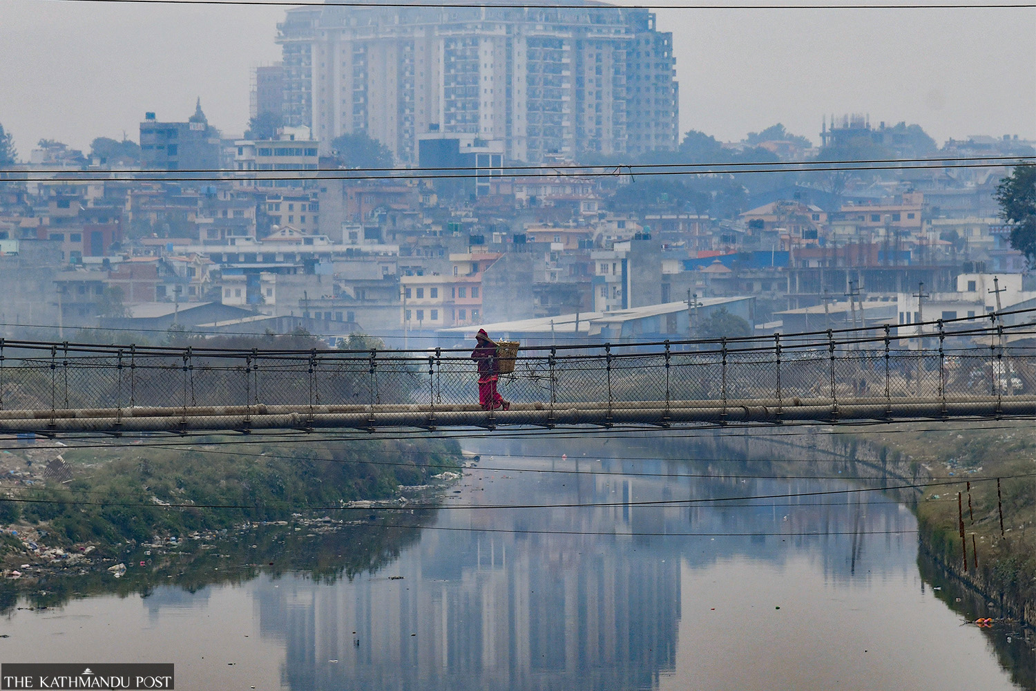 A woman with a wicker basket is pictured crossing a suspension bridge over the Bagmati River at Dhobighat in Lalitpur in this recent photo. In the background are the high-rise apartment buildings of Sanepa Heights. Deepak KC/TKP