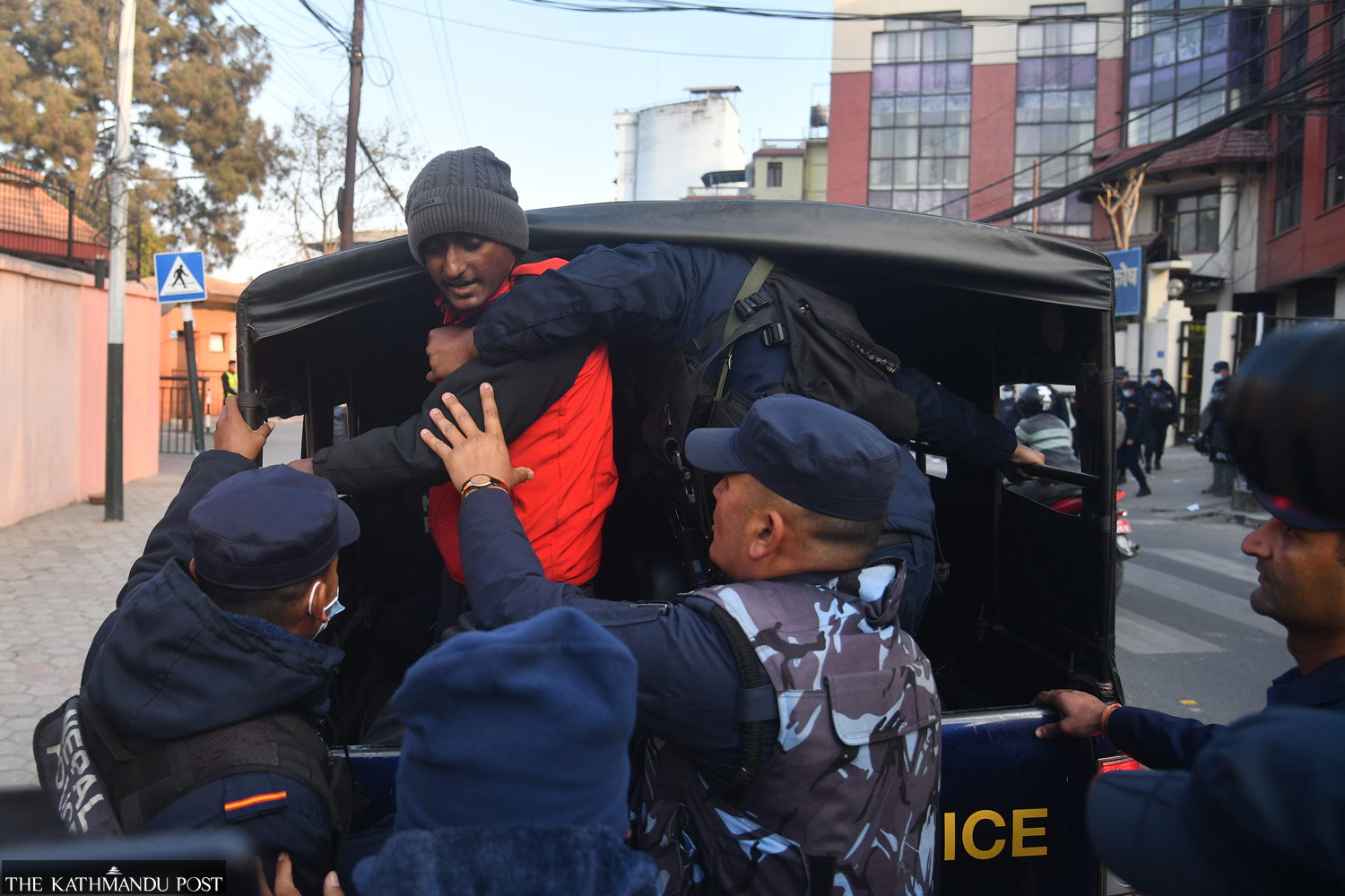 Police detain Aarati Sah’s brother Prem, who was staging a demonstration demanding justice for his deceased sister, outside the office of the National Human Rights Commission in Pulchowk on Monday. Aarati was found dead at her home in Janakpur on May 21 last year under suspicious circumstances. Her maternal family alleges she was murdered by her husband and in-laws. Deepak KC/TKP