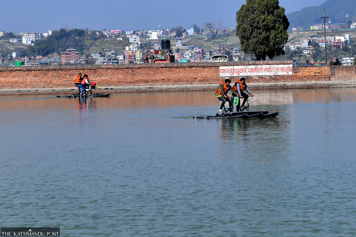 People take a ride on water bicycles at Na: Pukhu in Bhaktapur recently. Hemanta Shrestha/TKP