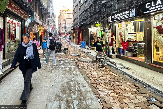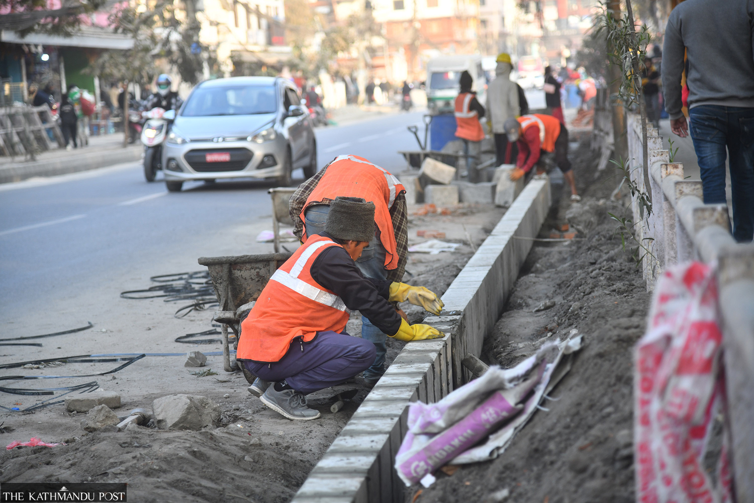 Construction workers repair a road section at Pradarshani Marg in Kathmandu on Friday. Deepak KC/TKP