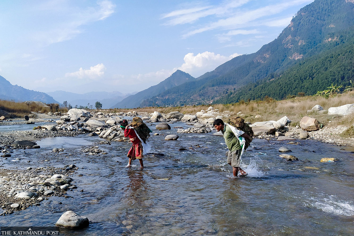 Local residents carry loads across Likhu River at Chhahare in Nuwakot last week. Deepak KC/TKP