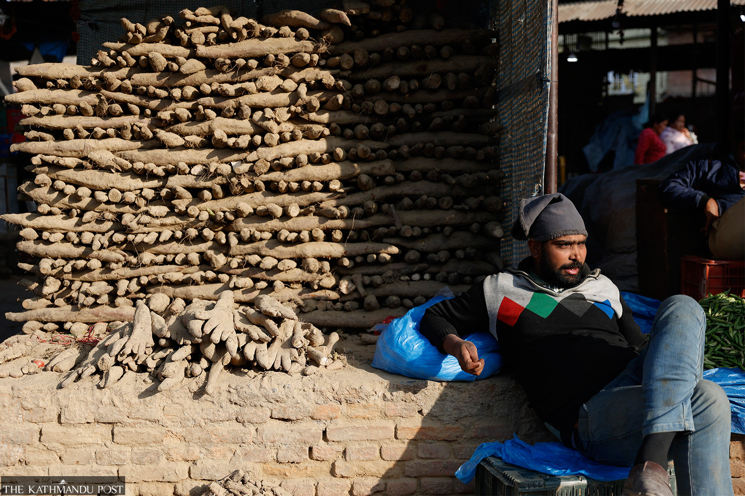 A vendor basks in the afternoon sun besides of yam at Kalimati vegetable market in Kathmandu recently. Yams hold a special significance in the upcoming Maghe Sankranti festival. Sanjog Manandhar/TKP