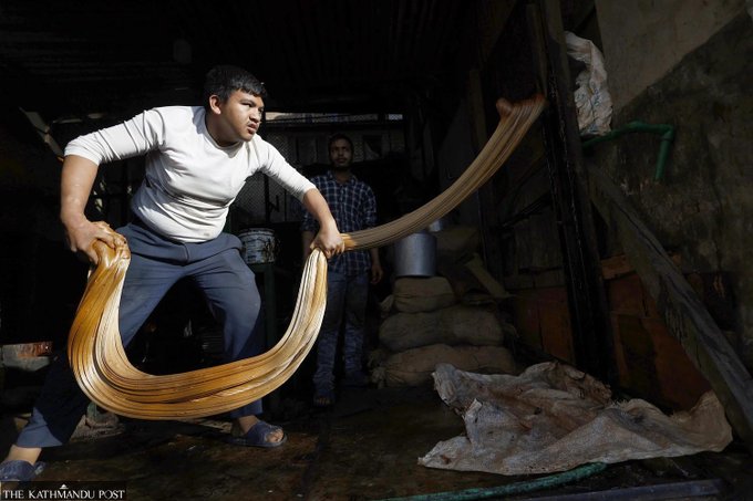 A man makes chaku at Tokha Chaku Udhyog in Kathmandu on Wednesday. Chaku is a Newari confectionery made from concentrated sugarcane juice, jaggery, ghee, and nuts, and holds significance during Maghe Sankranti. Sanjog Manandhar/TKP