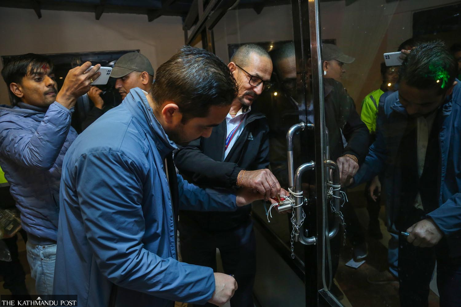 Kathmandu district administration officials and plainclothes policemen lock and wax-seal Lainchaur Banquet, a party venue, on the Nepal Scouts property at Lainchaur on Thursday evening. Nepali Congress lawmaker Deepak Khadka is accused of illegally occupying the property. Prakash Chandra Timilsena/TKP