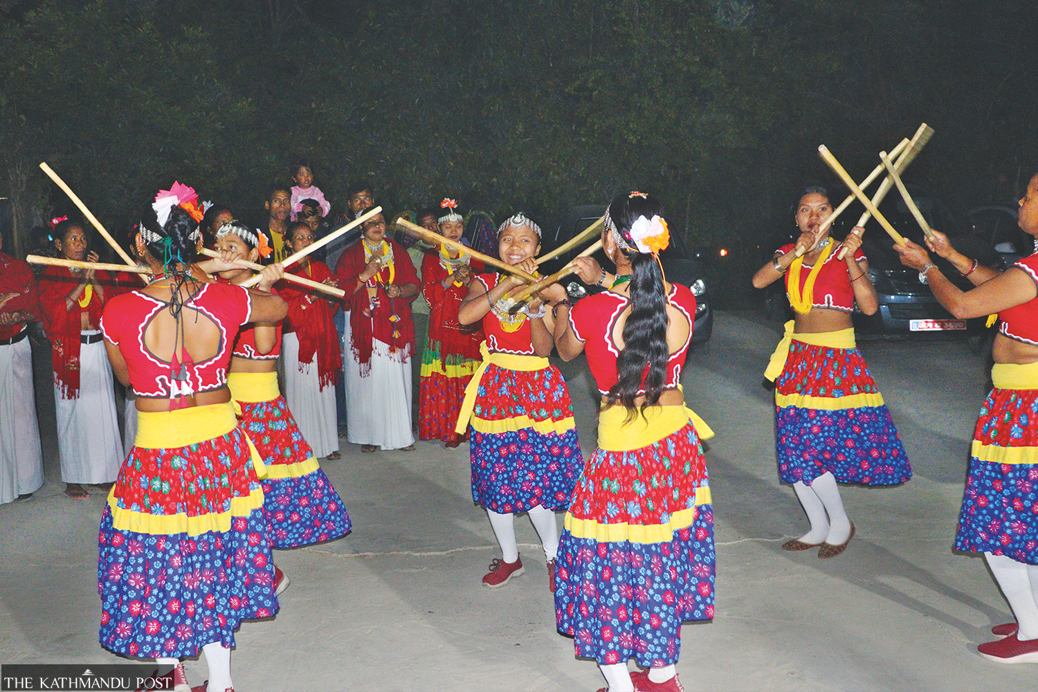 Women perform Lathi Naach, a traditional Tharu cultural dance, at the Thakurdwara village in Bardiya recently. Manoj Paudel/TKP
