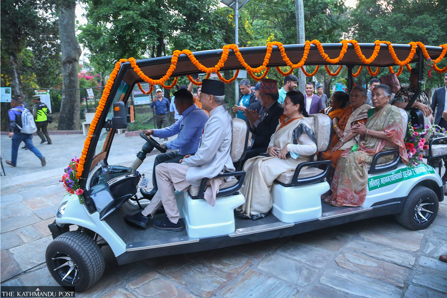 Former President Bidya Devi Bhandari and Lalitpur Mayor Chiribabu Maharjan (second row), among others, are seen enjoying the inaugural golf cart ride at Central Zoo in Jawalakhel on Friday. The electric vehicle was gifted to the zoo by the mayor earlier in the day to serve elderly and disabled visitors. Prakash Chandra Timilsena/TKP