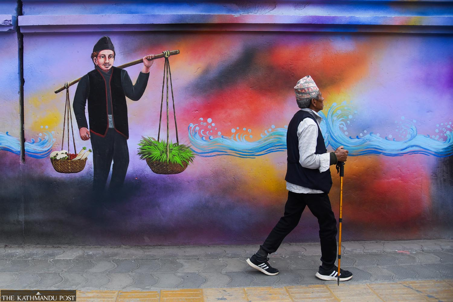 A man walks past a mural in Kathmandu on Monday. The Kathmandu Metropolitan City has started painting murals in various public places to promote the local cultural heritage. Sukarya Lal Shrestha/TKP