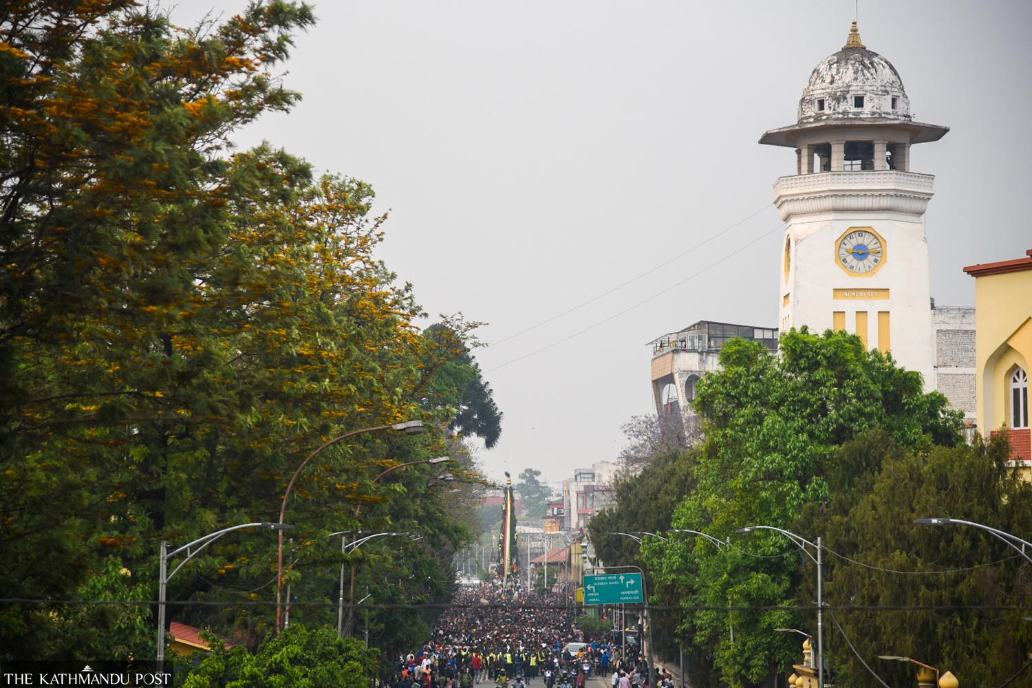 Devotees pull the chariot of Janabaha Dya—the Seto Machhindranath—from Durbarmarg to Ason in Kathmandu on the first day of Seto Machhindranath Jatra on Tuesday. Sukarya Lal Shrestha/TKP