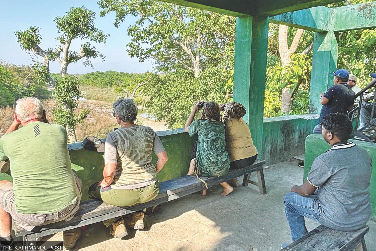 Tourists scan their surroundings for a view of tiger from an observation tower at Tinkune in Bardiya National Park on Tuesday. Manoj Paudel/TKP