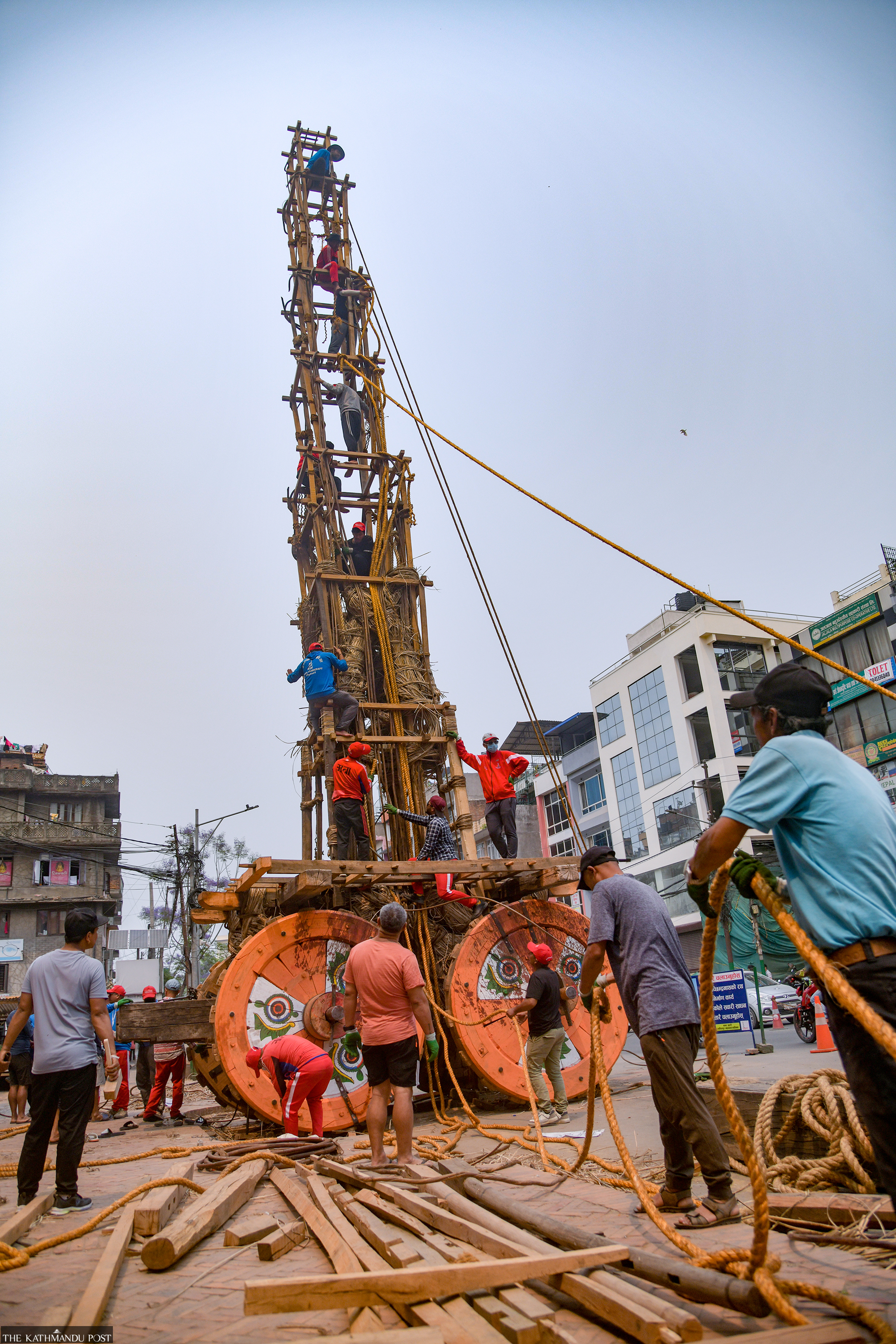 Locals at work to build the chariot for the upcoming Rato Machhindranath jatra at Pulchowk, Lalitpur, on Saturday. Deepak KC/TKP