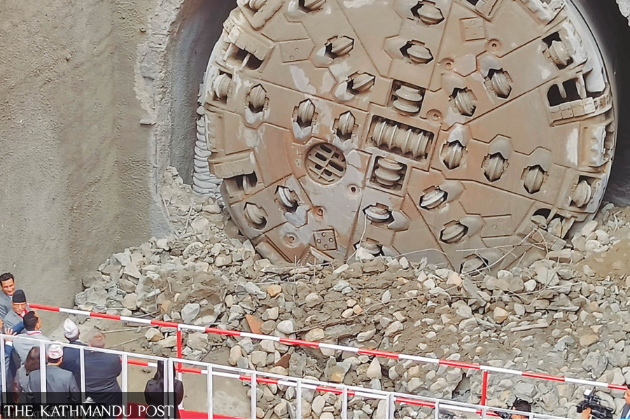 Prime Minister Pushpa Kamal Dahal and senior officials witness the breakthrough of the Rs10.05 billion tunnel for the Sunkoshi Marin multi-purpose project on Wednesday. Raj Kumar Karki/TKP