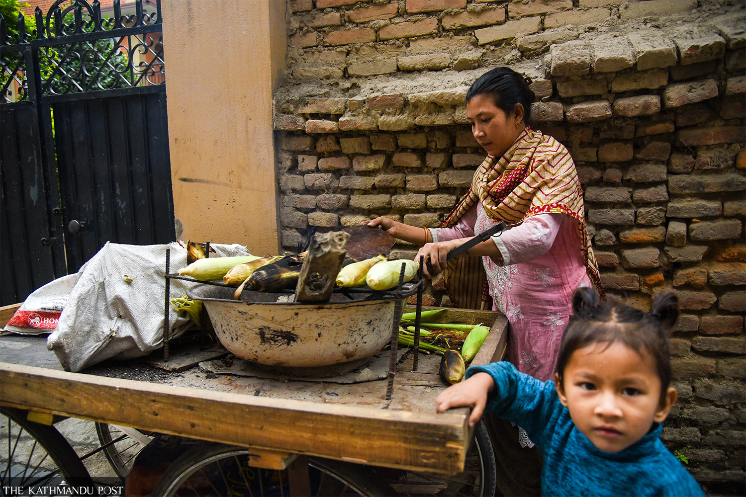 Binda Maya Magar, who hails from Gaighat, Udaypur, sells grilled corn at Ikhalukhu, Lalitpur on Tuesday. Her husband does housework while she sells corn in the afternoon, she said. Raj Magar, her son, sticks by her as the small business does not fetch enough money for his education. Sukarya Lal Shrestha/ TKP