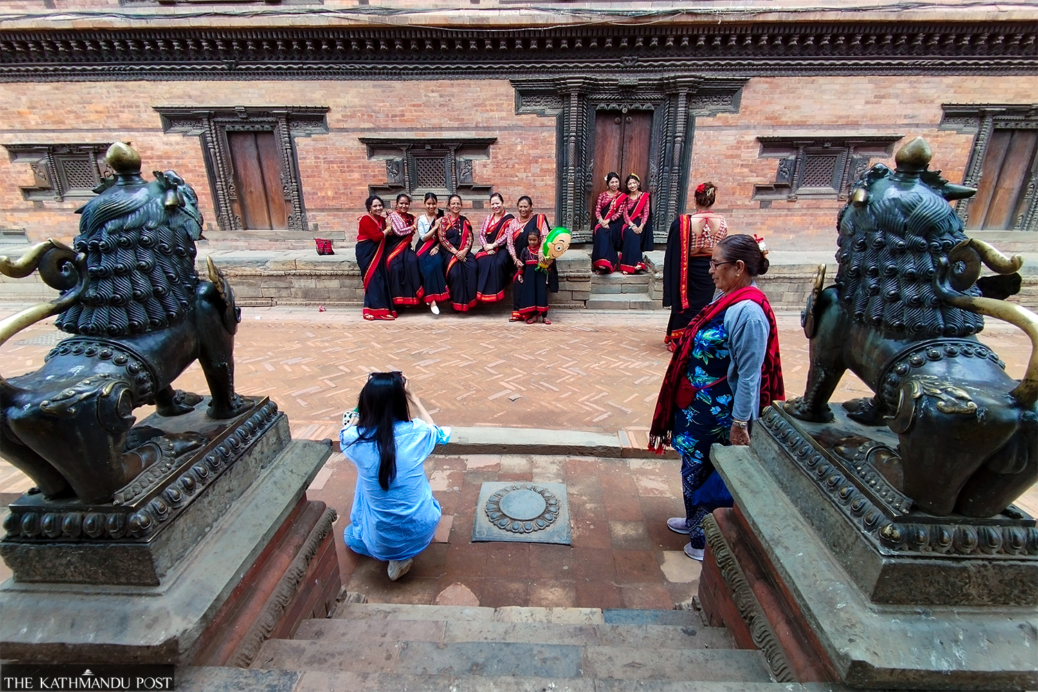 A group of women in traditional Newari attire pose for a foreign tourist at Bhaktapur Durbar Square on Monday. Deepak KC/TKP