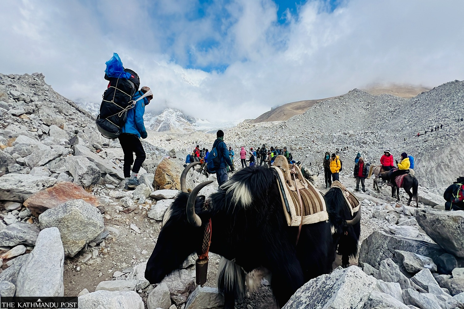 Trekkers and yaks are pictured in the Khumbu region in this recent photo. In the spring mountaineering season, the Everest Base Camp in Solukhumbu is abuzz with activity. Mahesh KC/TKP
