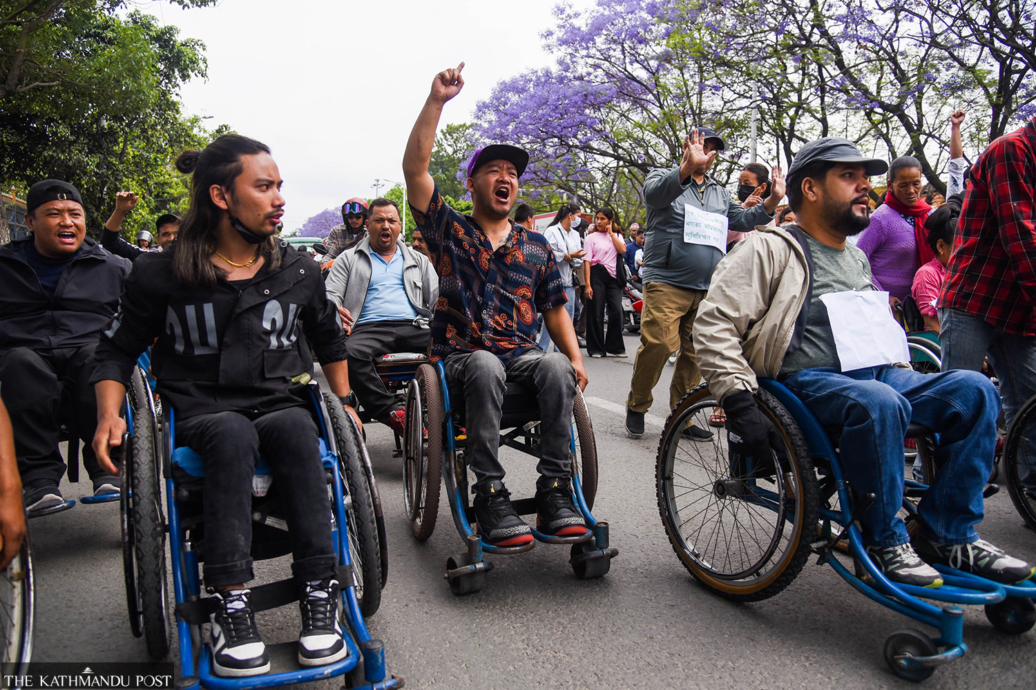 A demonstration from Ratnapark to Bhadrakali, asking the government to provide help to persons with disabilities, in Kathmandu on Sunday. The protesters also expressed solidarity with a hunger strike being staged at Shanti Vatika with various demands. Sukarya Lal Shrestha/ TKP