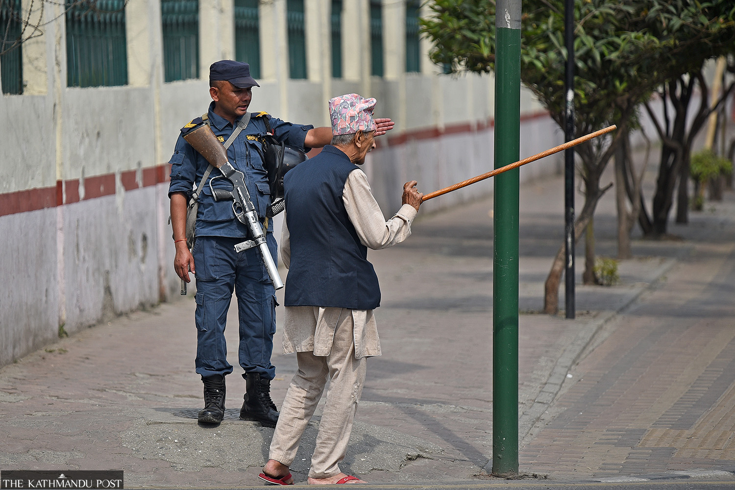 A policeman directs an elderly pedestrian off the sidewalk surrounding the Parliament complex in New Baneshwar on Friday. The pavement was closed off after Nepali Congress-aligned students demonstrated in the area demanding a parliamentary probe into the cooperatives scam. Angad Dhakal/TKP