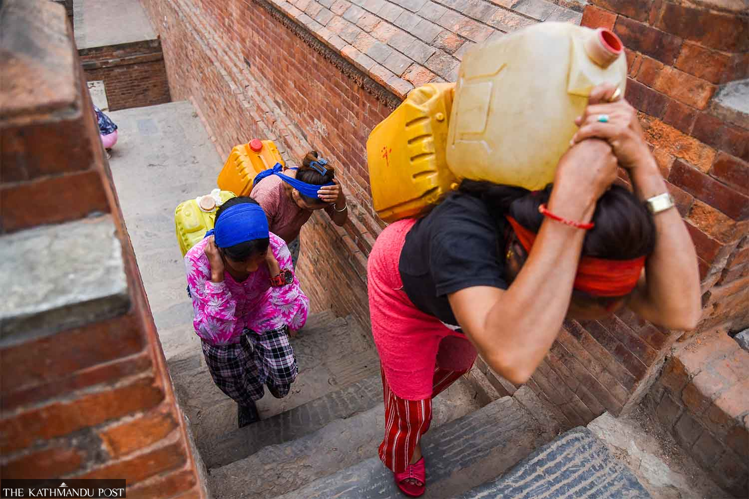 Women lugging drinking water in jerry cans pictured at a Malla-era bath in Patan, in this recent photo. Sukarya Lal Shrestha/ TKP