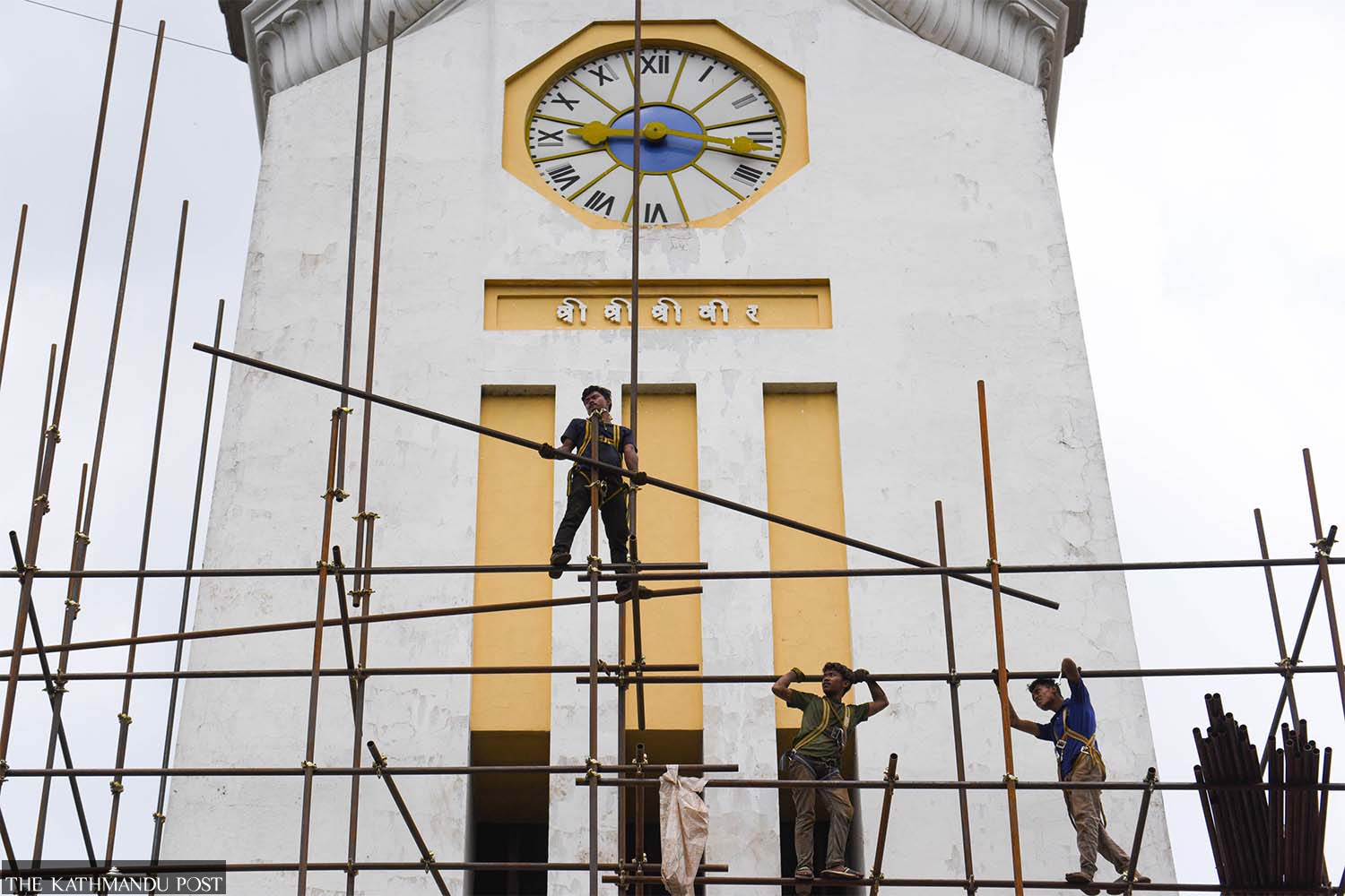 Workers set up scaffolding to renovate Ghantaghar, the late 19th century structure built by Rana PM Bir Shumsher, in Kathmandu on Tuesday. Safal Prakash Shrestha/ TKP