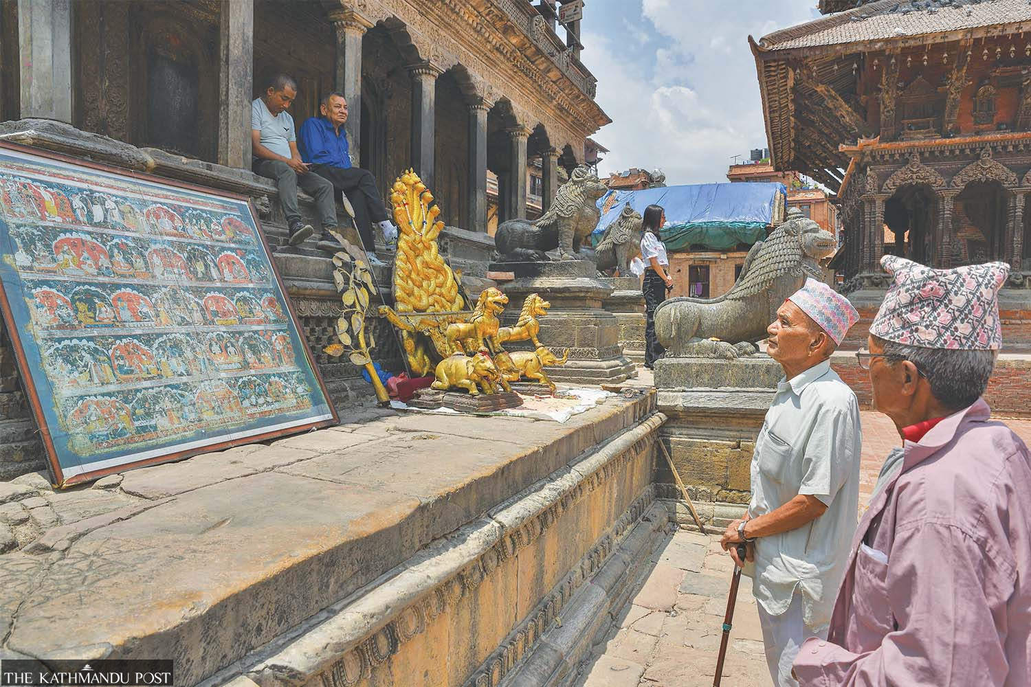 People look at the royal throne of the 17th-century king of Patan Shrinivas Malla and the songs penned by his father Siddhi Narsingh Malla. The throne and the 32 songs written by King Siddhi Narsingh are on public display, in a once-a-year event on the occasion of Jya Punhi at Krishna Mandir in Lalitpur, on Saturday. Safal Prakash Shrestha/ TKP