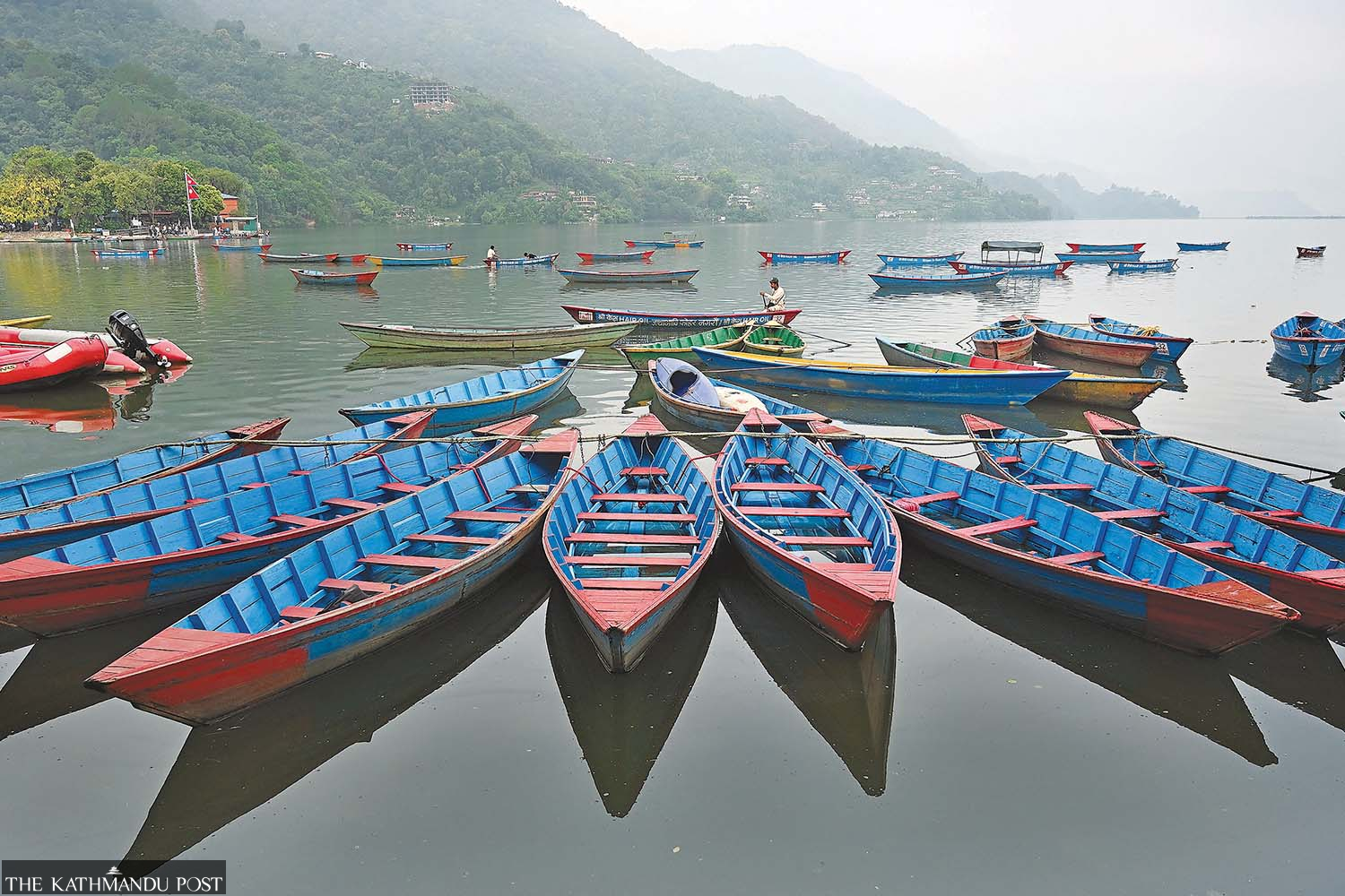 Neatly arranged wooden boats line the shore of Phewa Lake in Pokhara, while others row on the water on a recent morning. Angad Dhakal/TKP