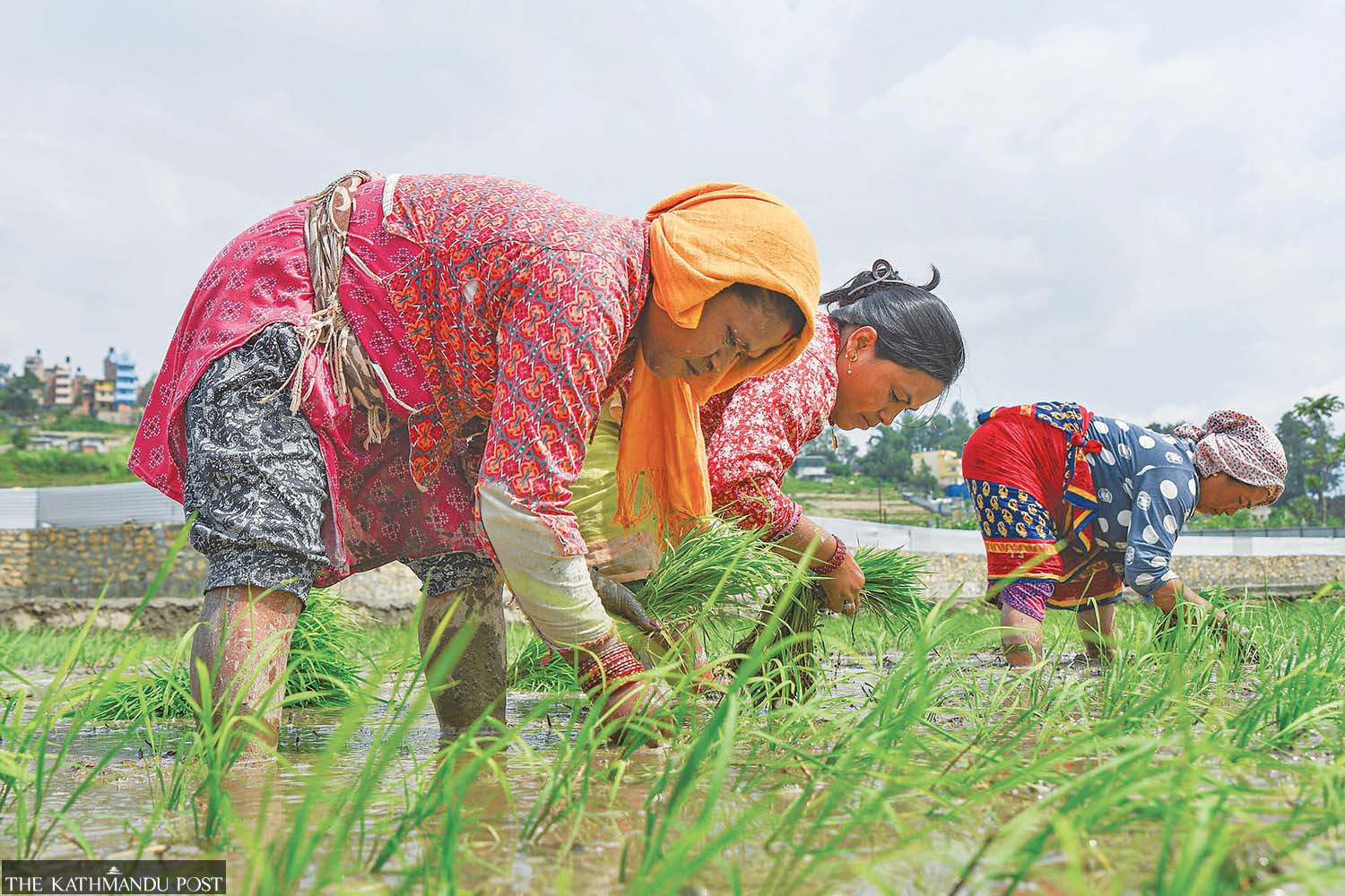 Women transplant paddy in Khokana, Lalitpur on Sunday. Rice plantation in Nepal generally peaks by June-end, subject to favourable weather. Safal Prakash Shrestha/ TKP