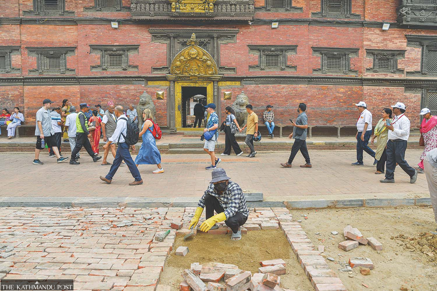 A construction worker paves the road at Mangalbazar, Patan, on Friday. Safal Prakash Shrestha/ TKP