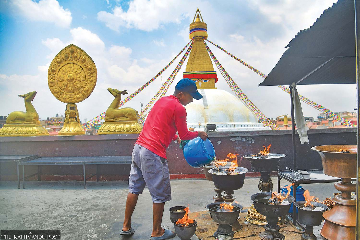 A worker adds oil to votive lamps at Bauddha Stupa in Kathmandu in this recent photo. Deepak KC/TKP