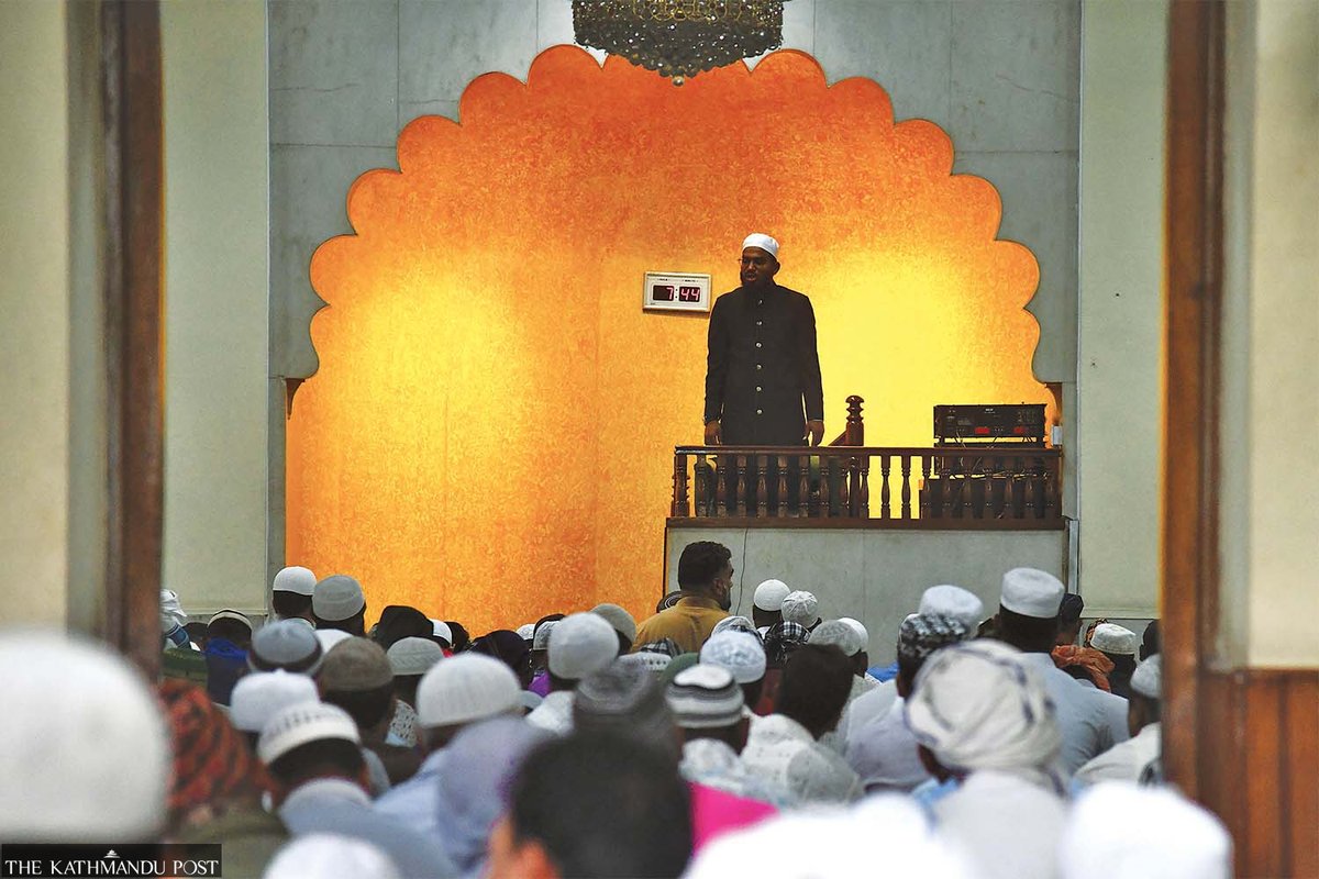 An imam leads prayers at Jame Masjid in Kathmandu, on the occasion of Bakr Eid, one of the two major Muslim festivals, on Monday. Deepak KC/TKP