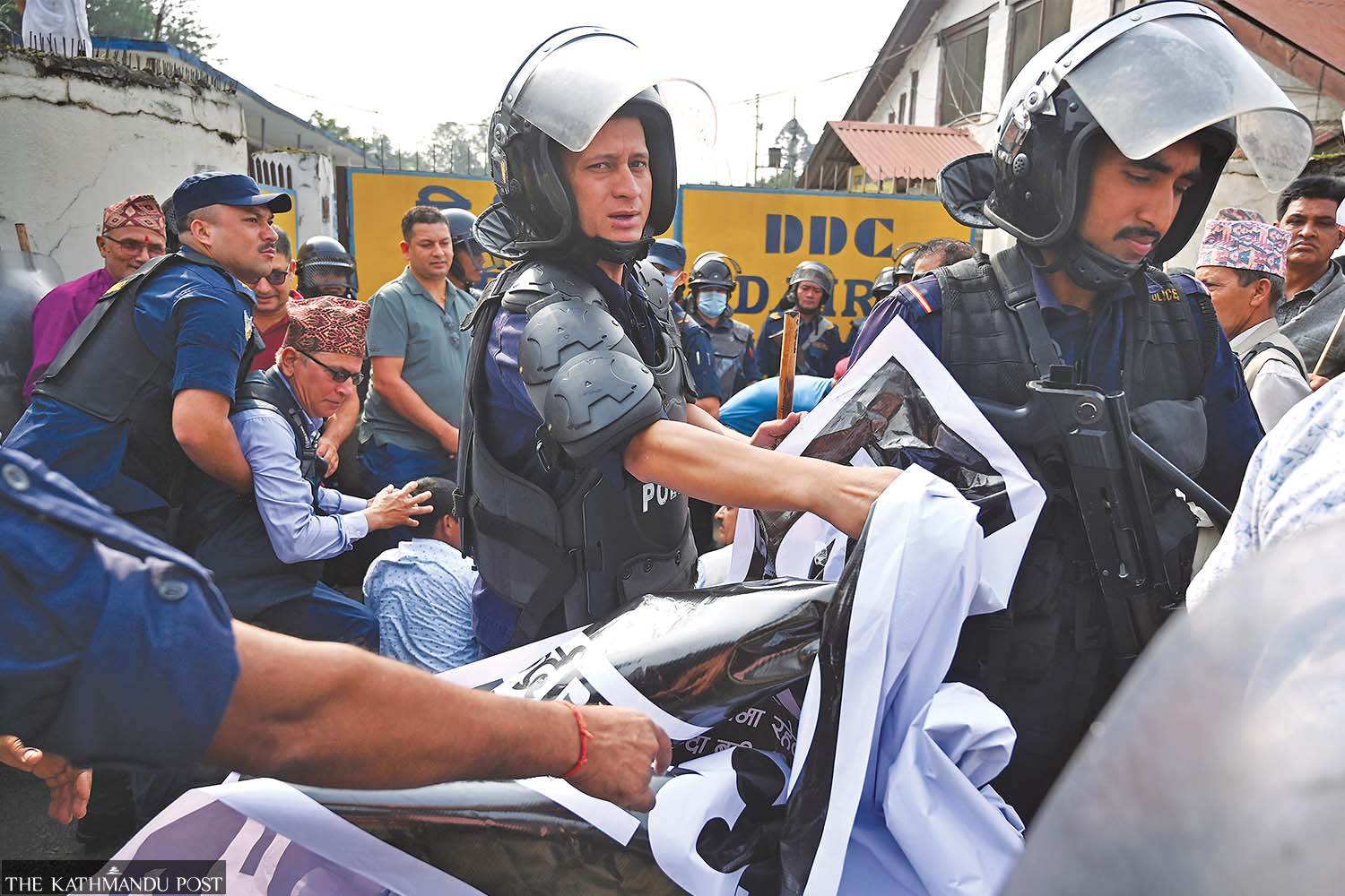 Police round up dairy farmers who were protesting demanding payment of their dues, at the DDC central office in Kathmandu on Wednesday. Angad Dhakal/TKP