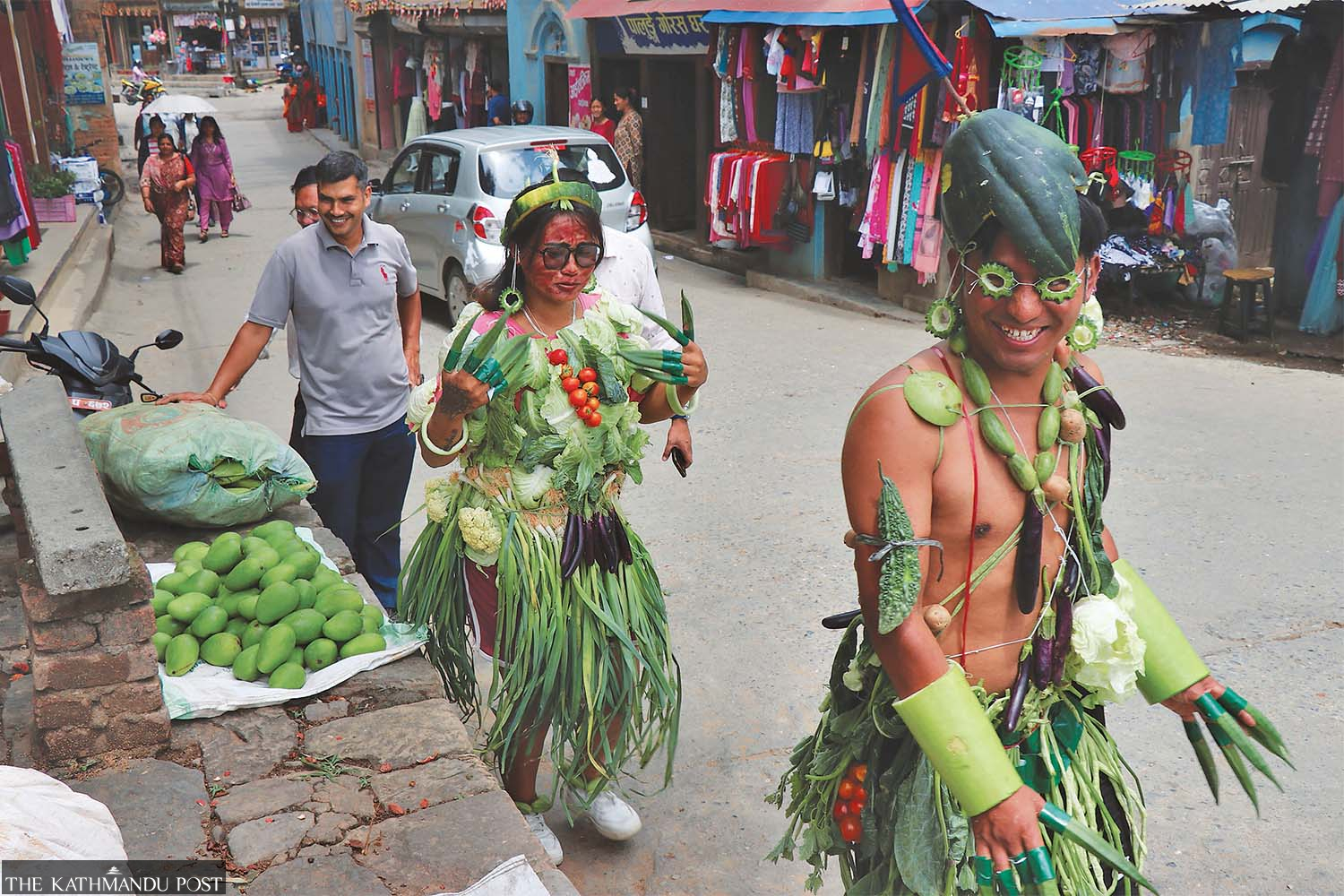 Youths go around Tansen wearing vegetables all over their body to promote local produce, in Palpa on Thursday Madhav Aryal/TKP