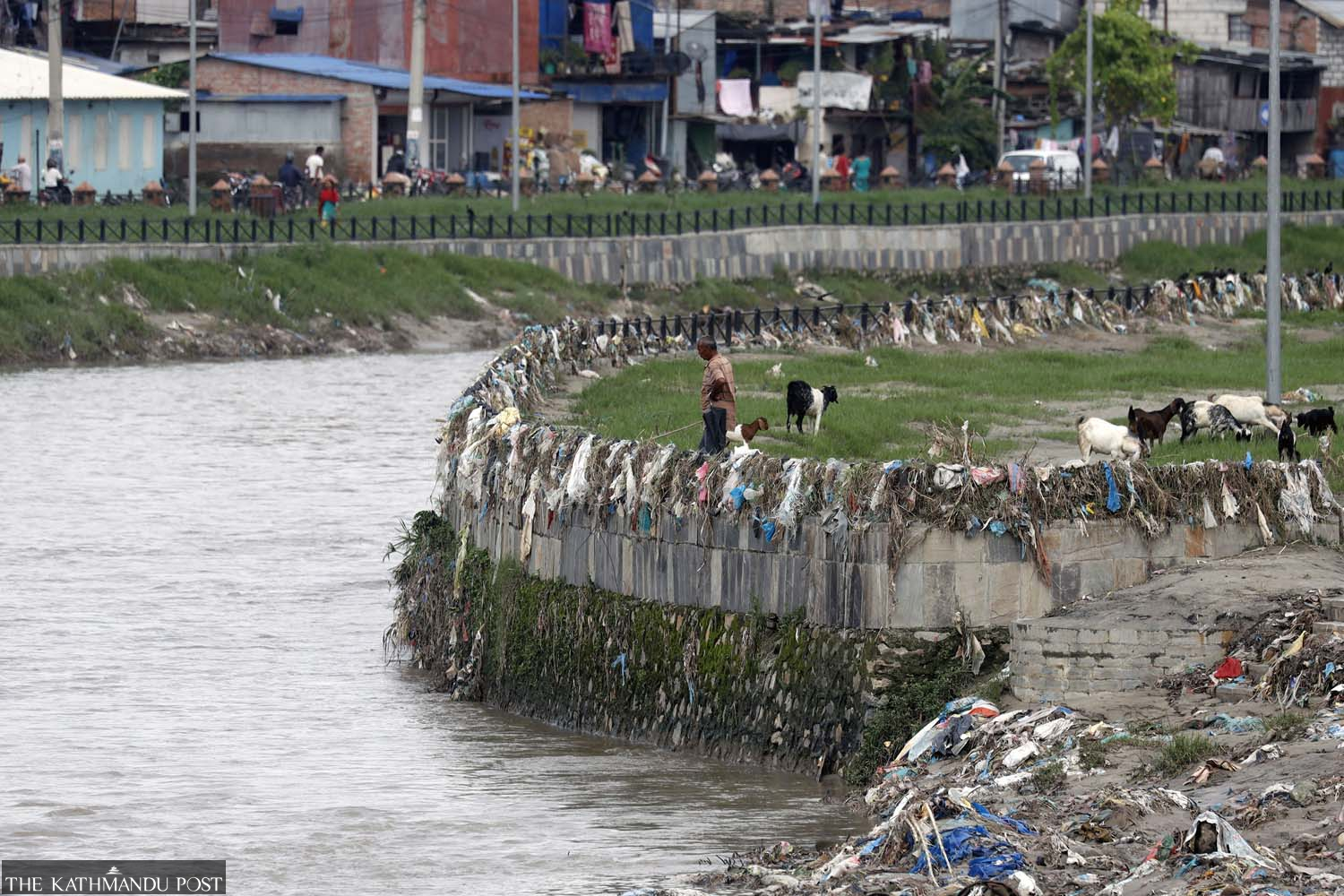 Trash materials brought by Bagmati River flooding a few days ago are seen stuck on the riverside rails at Sanepa in Lalitpur, on Wednesday. Hemanta Shrestha/TKP
