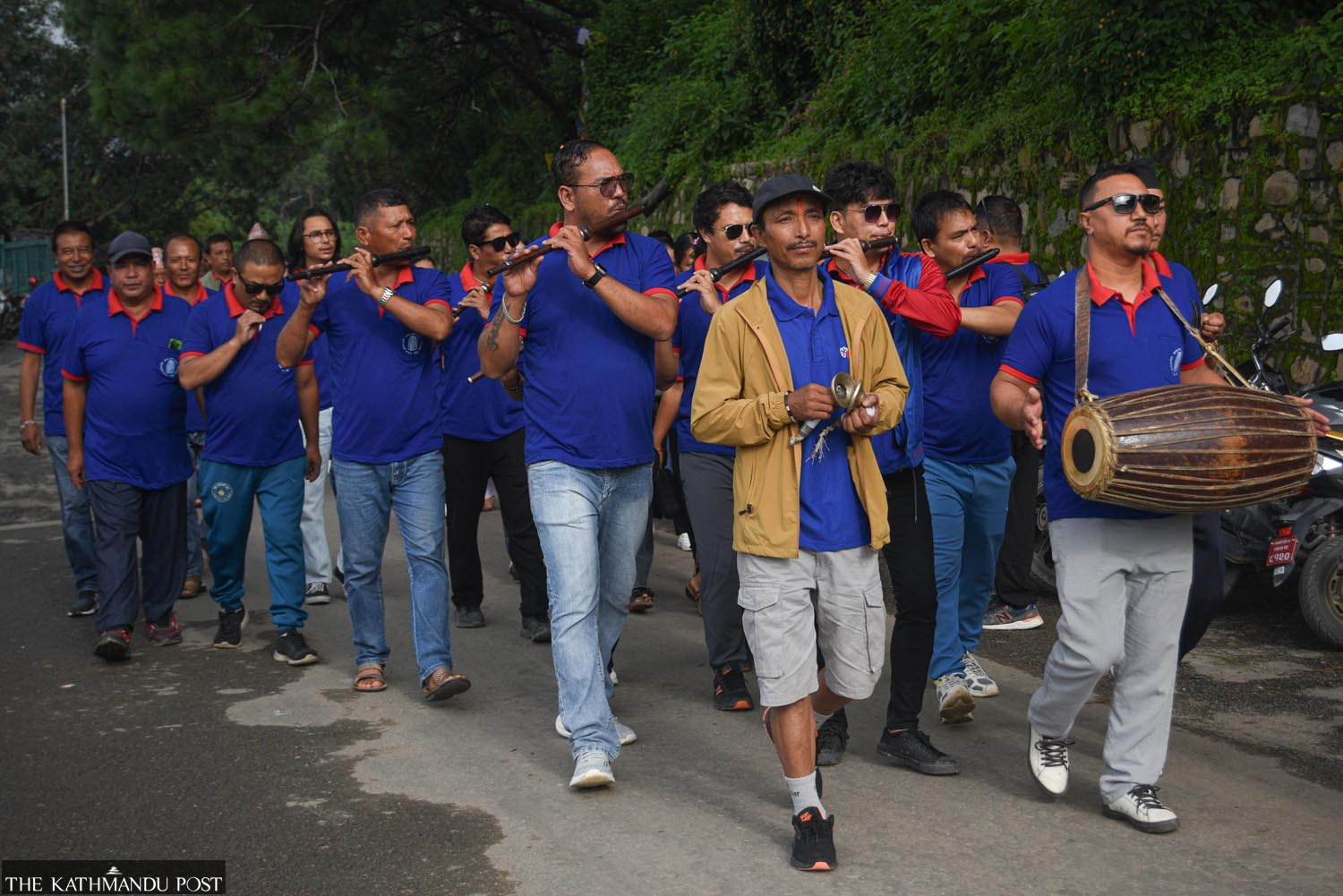 Men from Newa community play traditional musical instruments during the Gunla festival at Swayambhunath Stupa in Kathmandu on Saturday. Safal Prakash Shrestha/TKP
