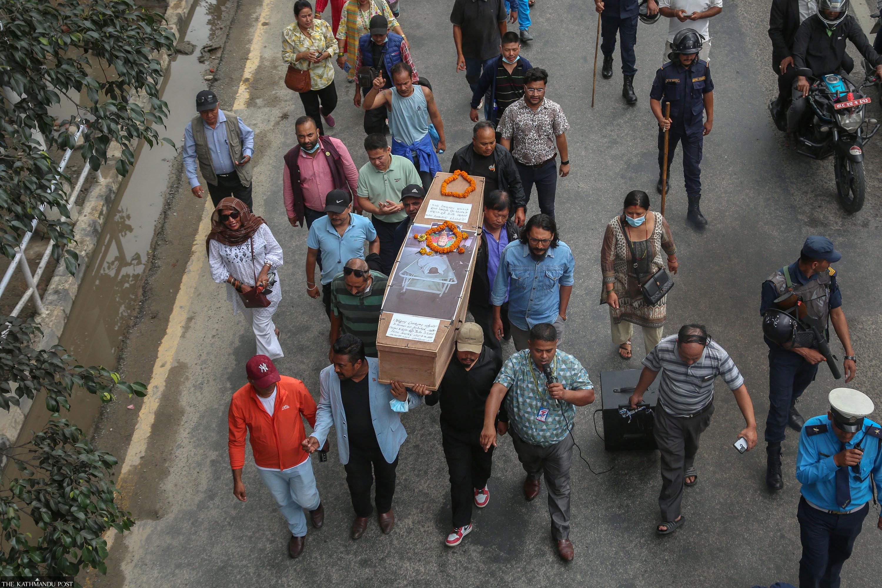 Depositors scammed by cooperatives protest in Kathmandu on Sunday, carrying a coffin. They said Rajendra Sthapit, who was admitted to Bir Hospital, had died without treatment, after the cooperative firm in which he had deposited millions of his savings refused to release the money. Prakash Chandra Timilsena/TKP