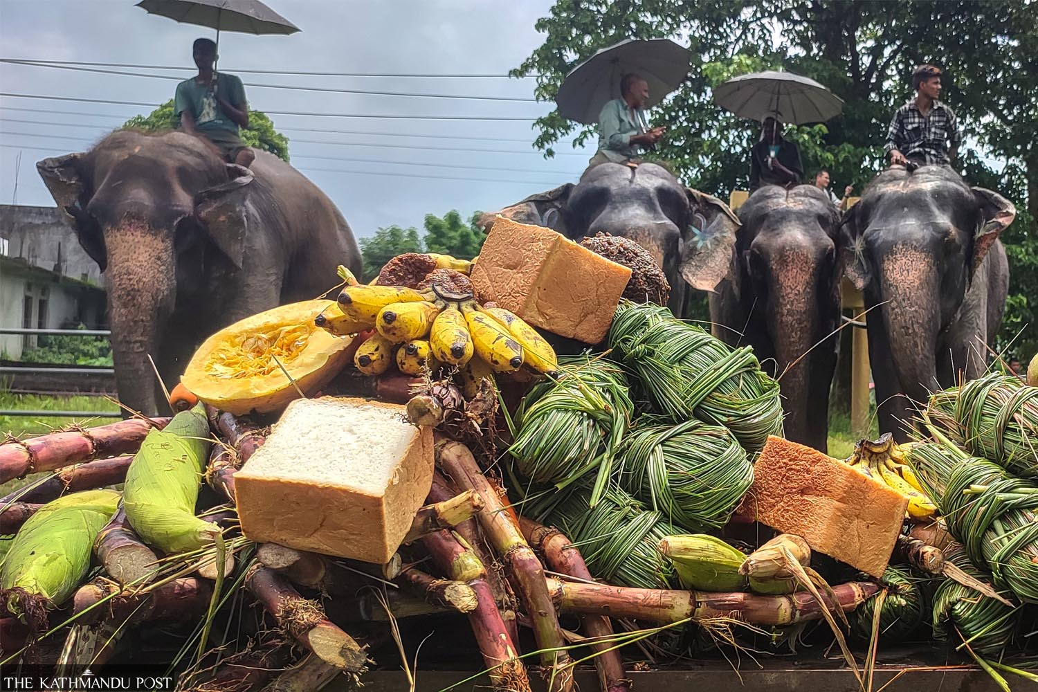 Elephants enjoy a special feast at the Community Forest Office in Baghmara, Chitwan on the occasion of World Elephant Day on Monday. Sixty elephants were given the special treat. Chitwan is home to 69 private and 56 government elephants. Ramesh Kumar Paudel/TKP