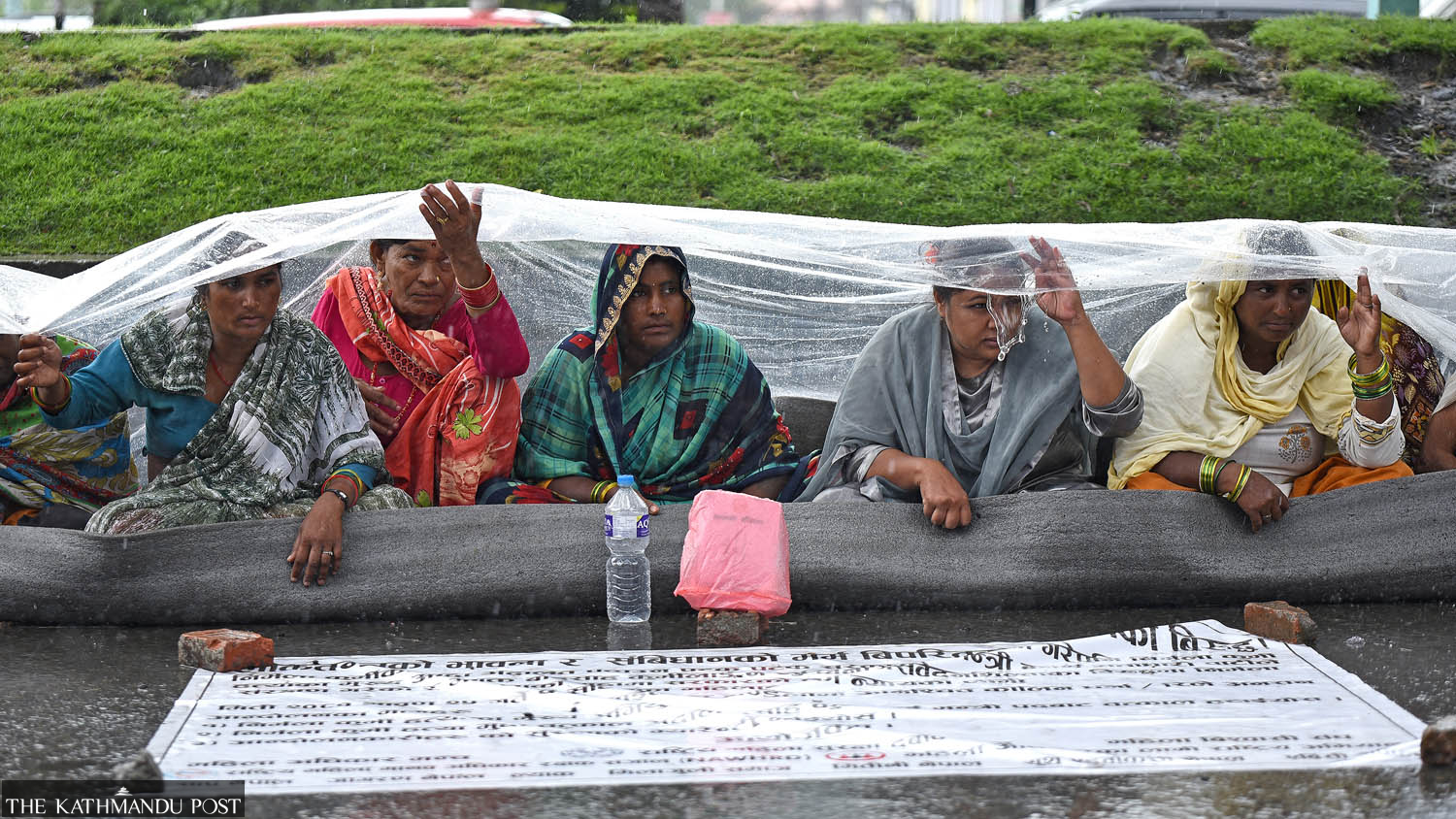 Rights activists brave the rain to stage a sit-in demanding justice for Nirmala Kurmi, who remains missing since 2010, at Maitighar in Kathmandu on Sunday. They resumed protest after Nepali Congress leader Badshah Kurmi, who is one of the main accused in her disappearance, was appointed minister in the Lumbini province earlier this month. Angad Dhakal/TKP