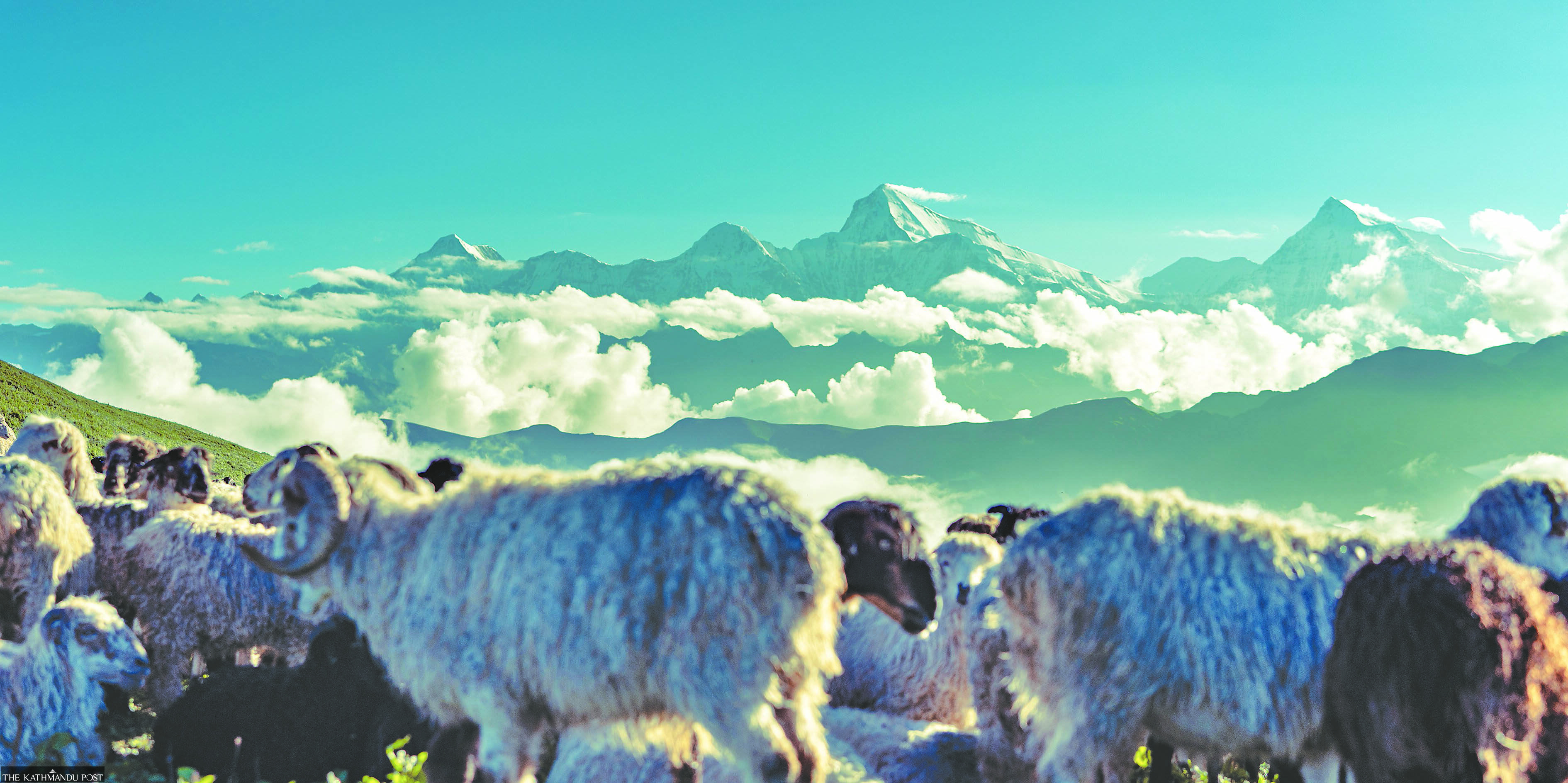 A flock of sheep is seen against the backdrop of clouds floating close to snowy mountains in this view captured from Chauri Lek in Putha Uttarganga rural municipality of Rukum (East). Mahesh KC/TKP