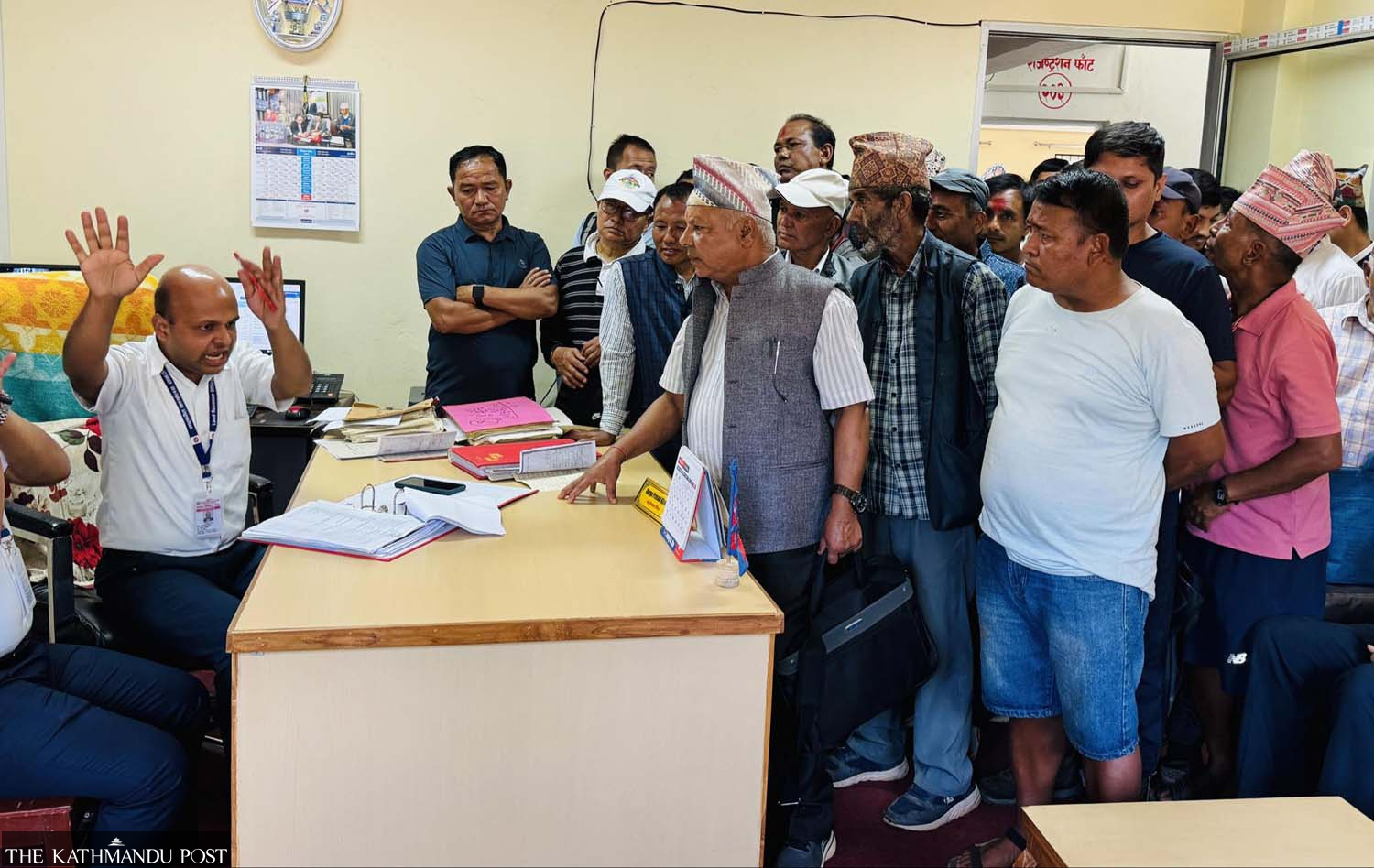 Tenants of the Amarnarayan Temple Trust land protest at the Land Revenue Office in Tansen, Palpa, on Monday after their rent increased tenfold since last year. About 1,500 residents live on the land of the trust, established by Kaji Amar Singh Thapa in 1863 BS (circa 1805 AD). Madhav Aryal/TKP