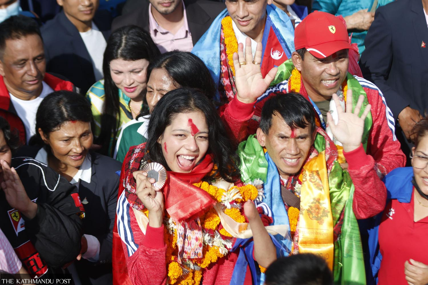 Nepali athlete Palesha Goverdhan, who won a bronze at Paris Paralympics, receives a celebratory welcome upon arrival at the Tribhuvan International Airport in Kathmandu on Wednesday. Hemanta Shrestha/TKP